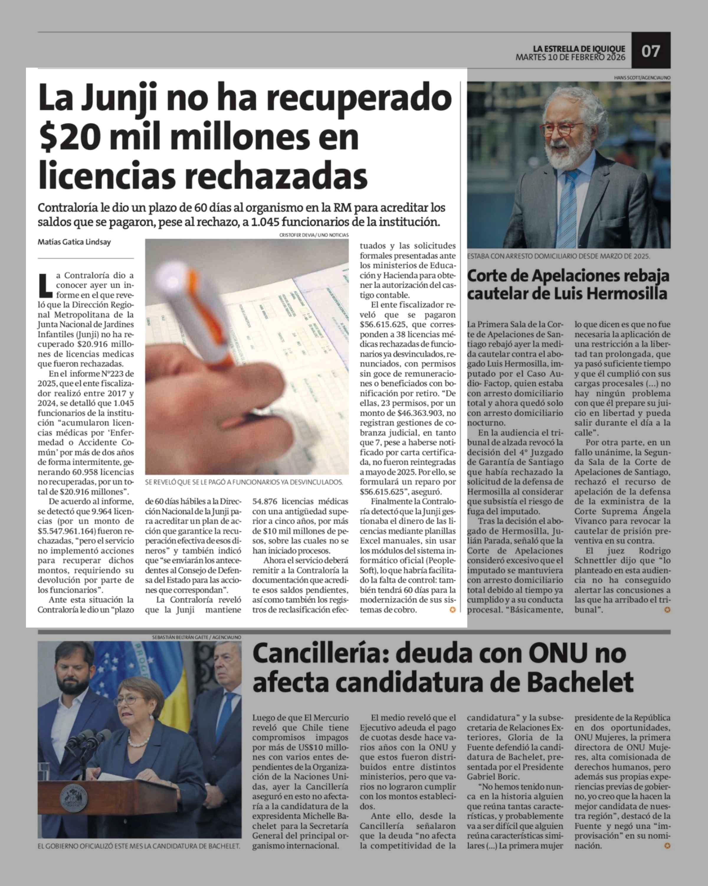 La Junji no ha recuperado $20 mil millones en licencias rechazadas 10-02-2026 La Estrella de Iquique |