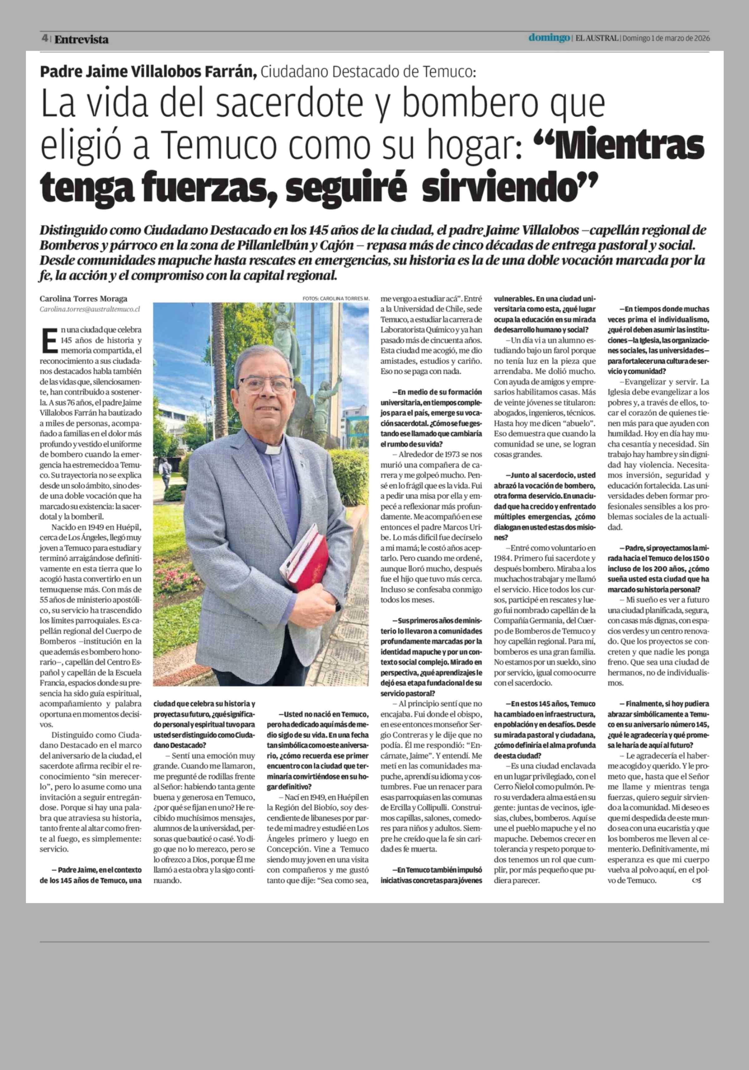 La vida del sacerdote y bombero que eligió a Temuco como su hogar: "Mientras tenga fuerzas, seguiré sirviendo" 01-03-2026 El Austral de la Araucanía |