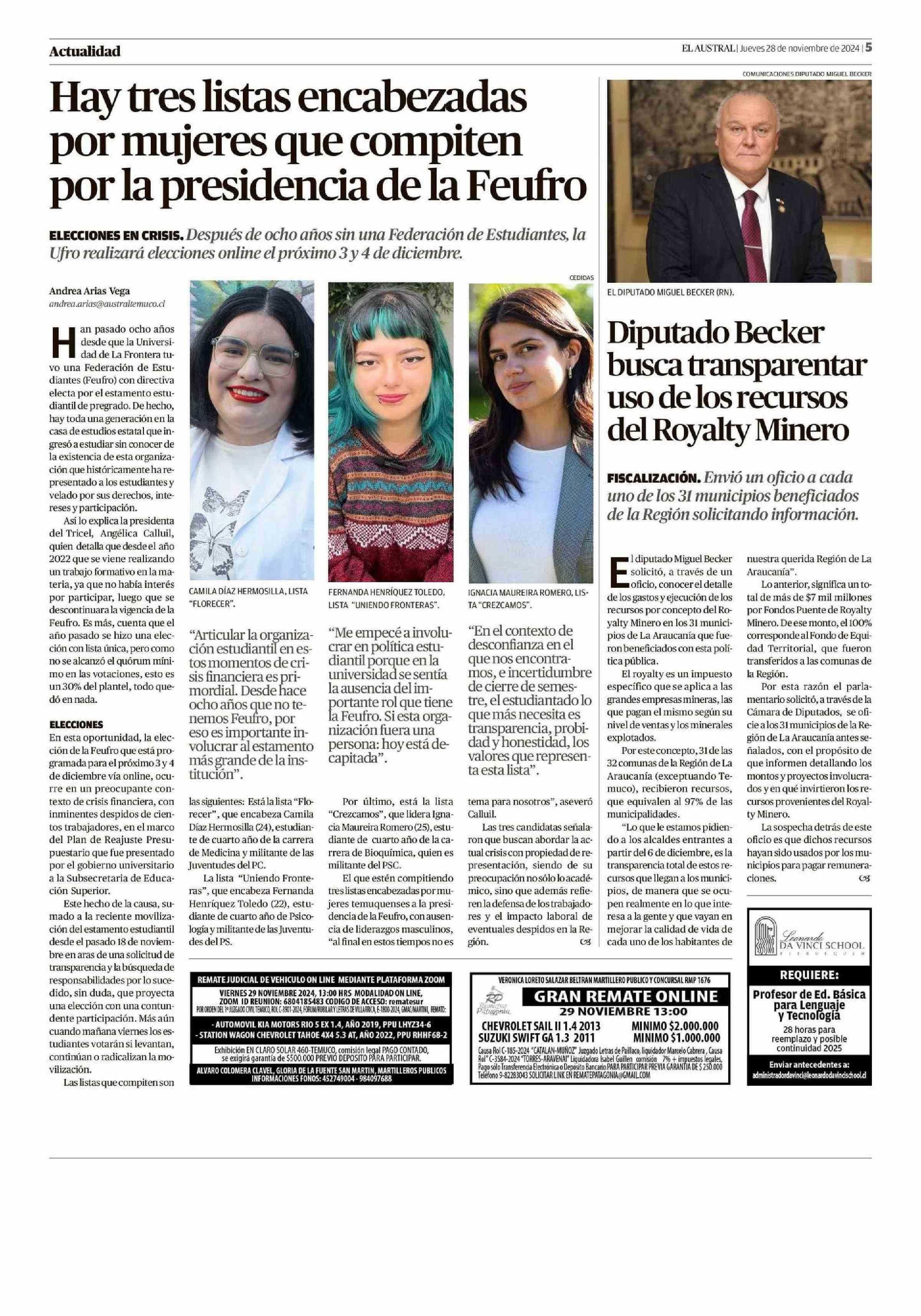 Hay tres listas encabezadas por mujeres que compiten por la presidencia de la Feufro 28-11-2024 El Austral de la Araucanía |