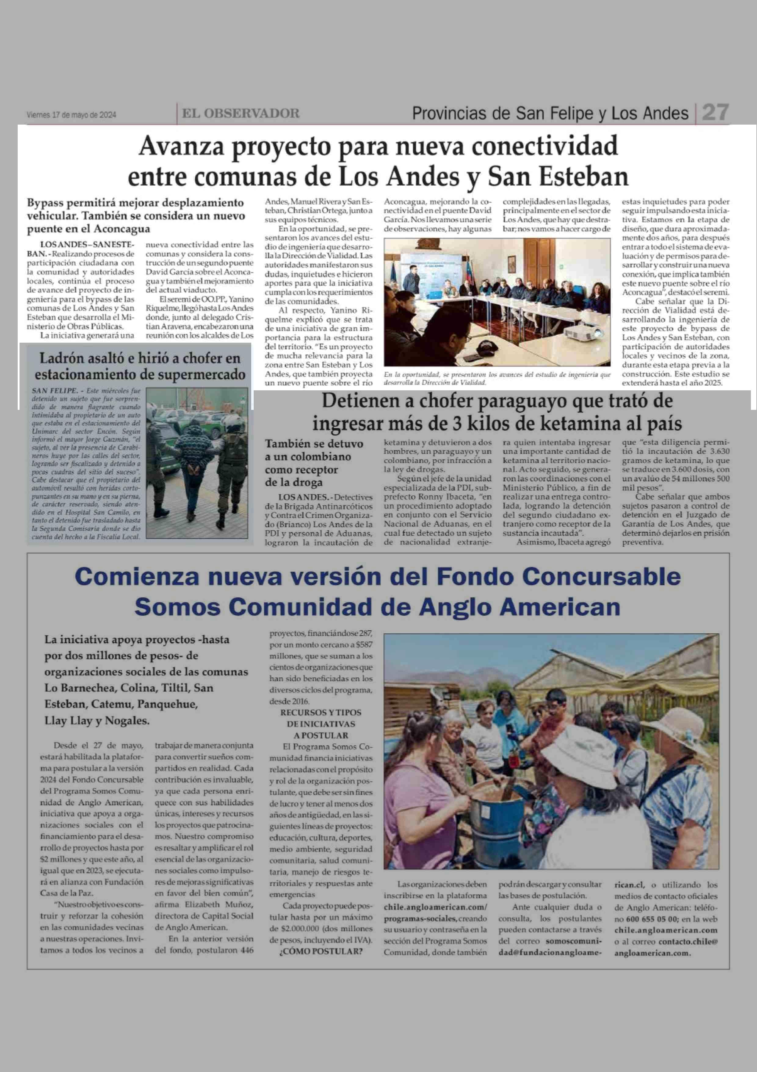 Avanza proyecto para nueva conectividad entre comunas de Los Andes y San Esteban 17-05-2024 El Observador |