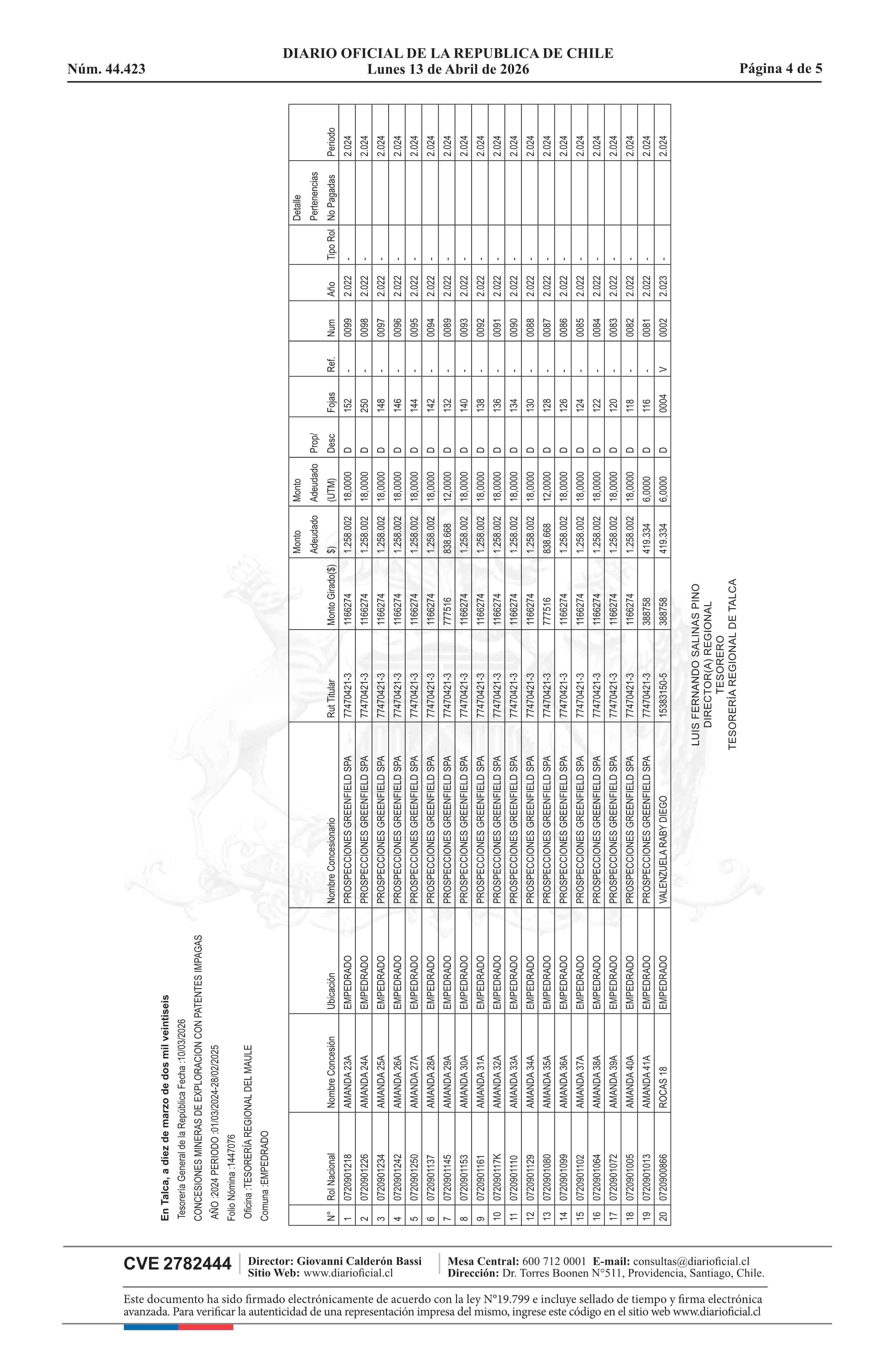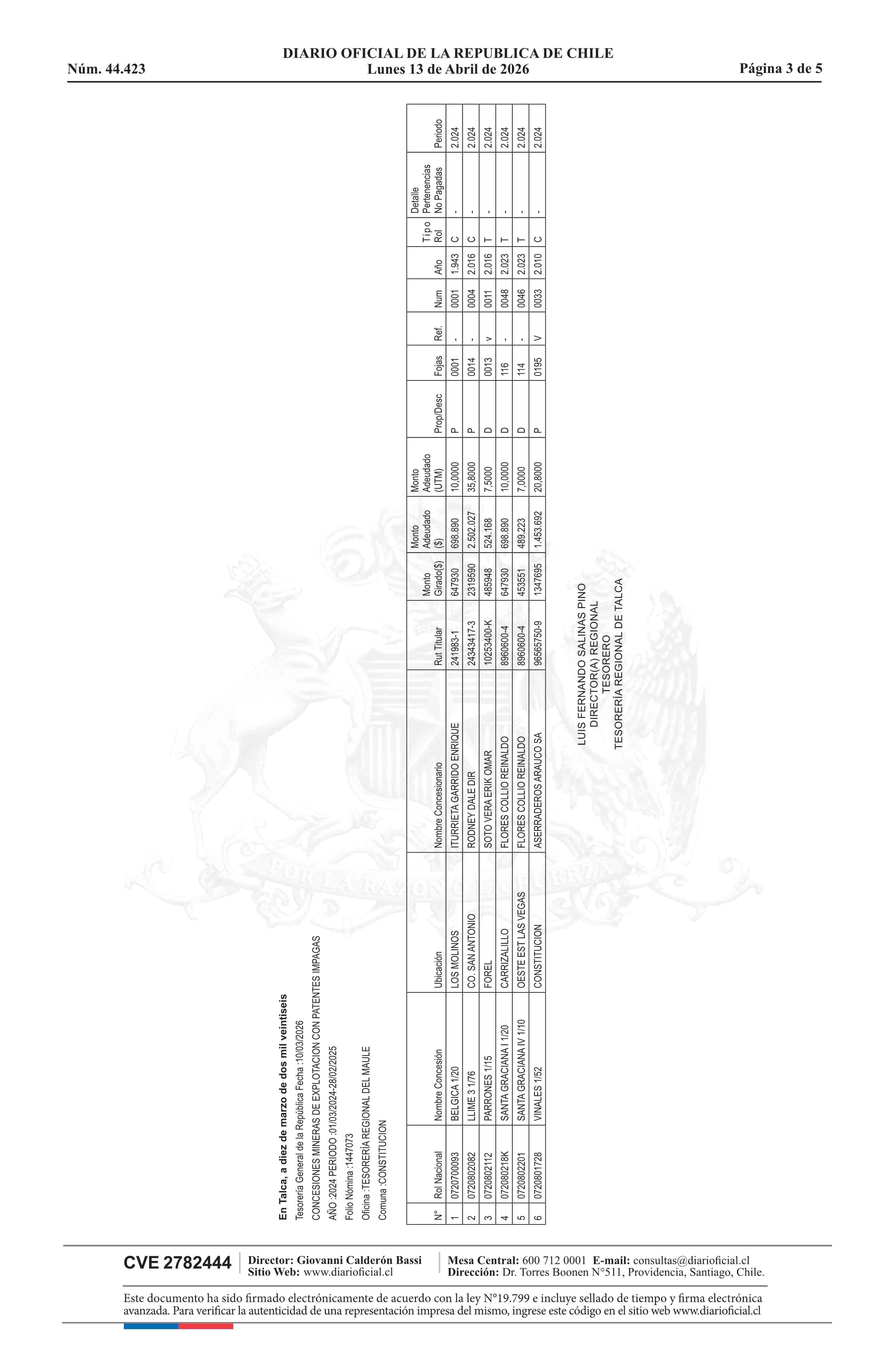 | Fuente: | DIARIO OFICIAL CHILE - BOLETÍN OFICIAL DE MINERÍA (DIARIO OFICIAL CHILE – BOM – NÓMINA REMATE) | Página(s): | 1-5 |
