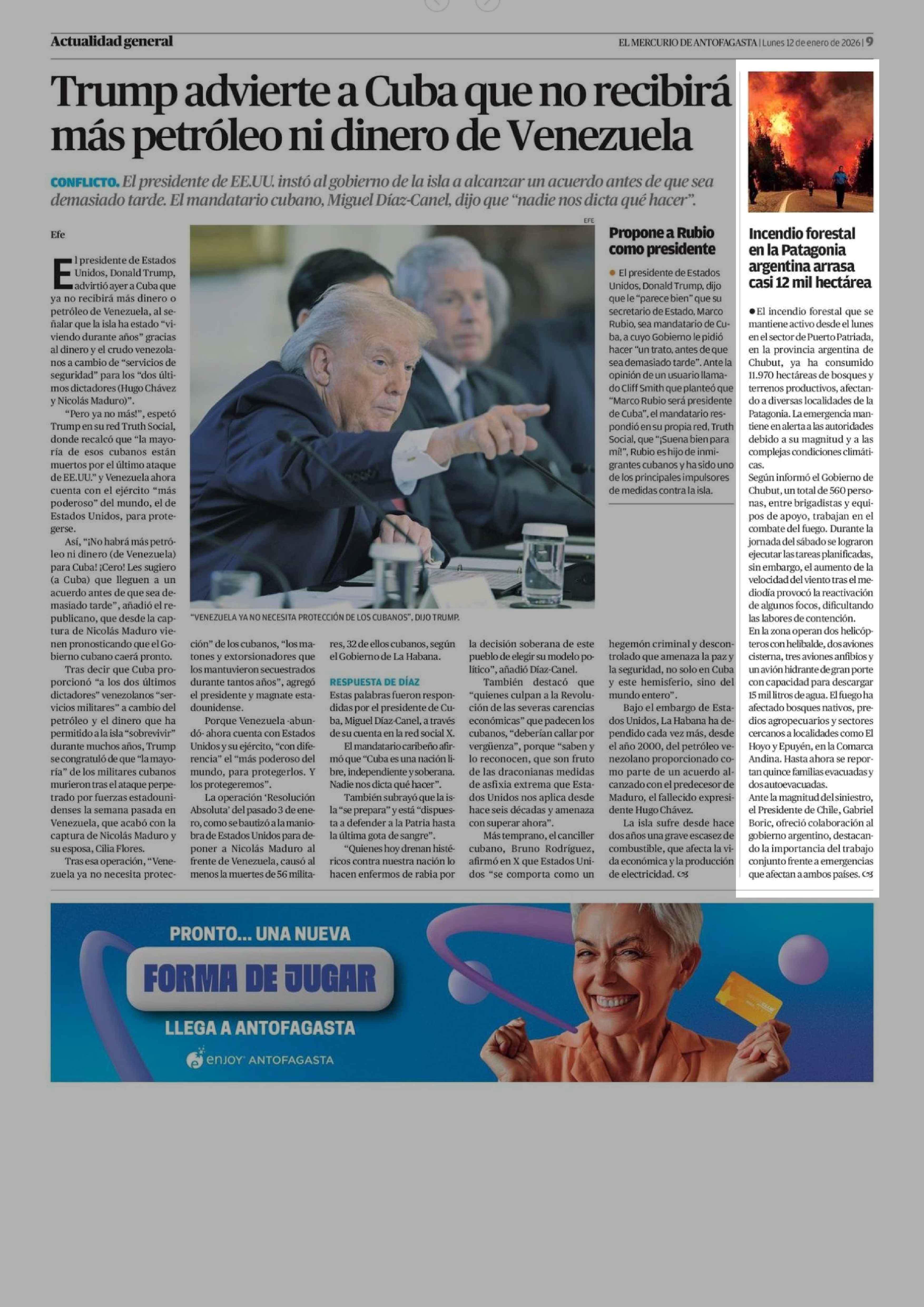 Incendio forestal en la Patagonia argentina arrasa casi 12 mil hectárea 12-01-2026 El Mercurio de Antofagasta |