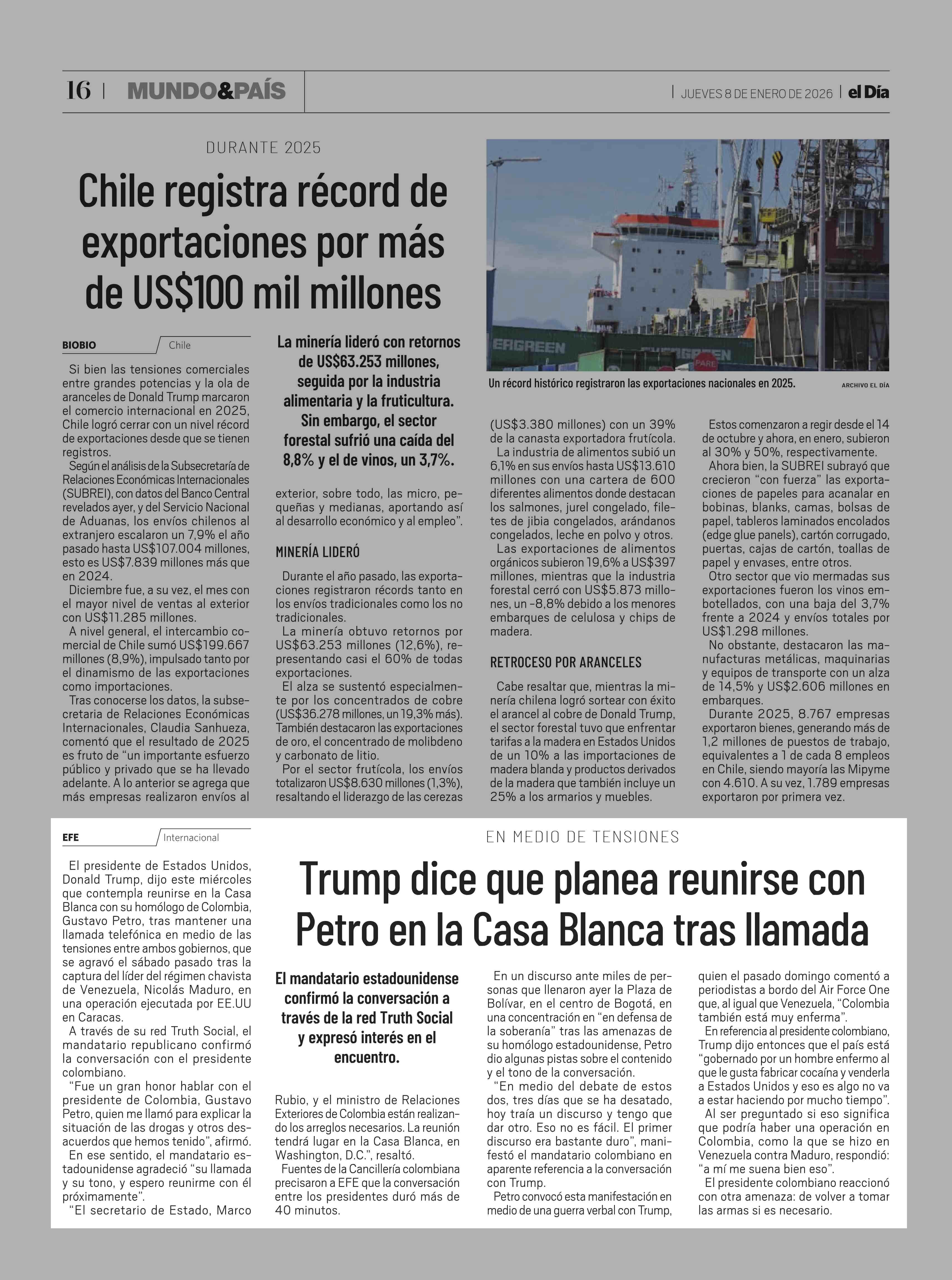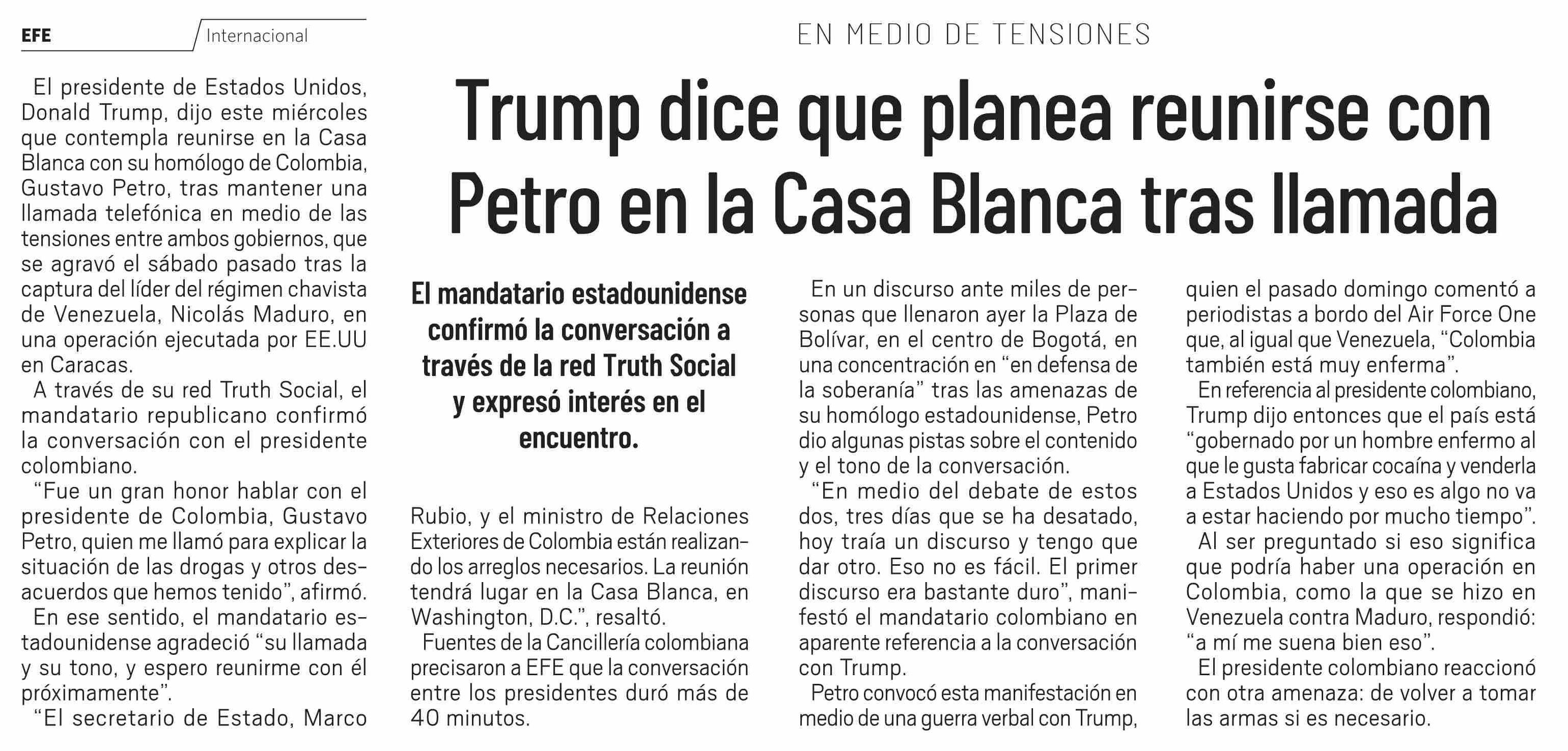 Trump dice que planea reunirse con Petro en la Casa Blanca tras llamada 08-01-2026 El Día |
