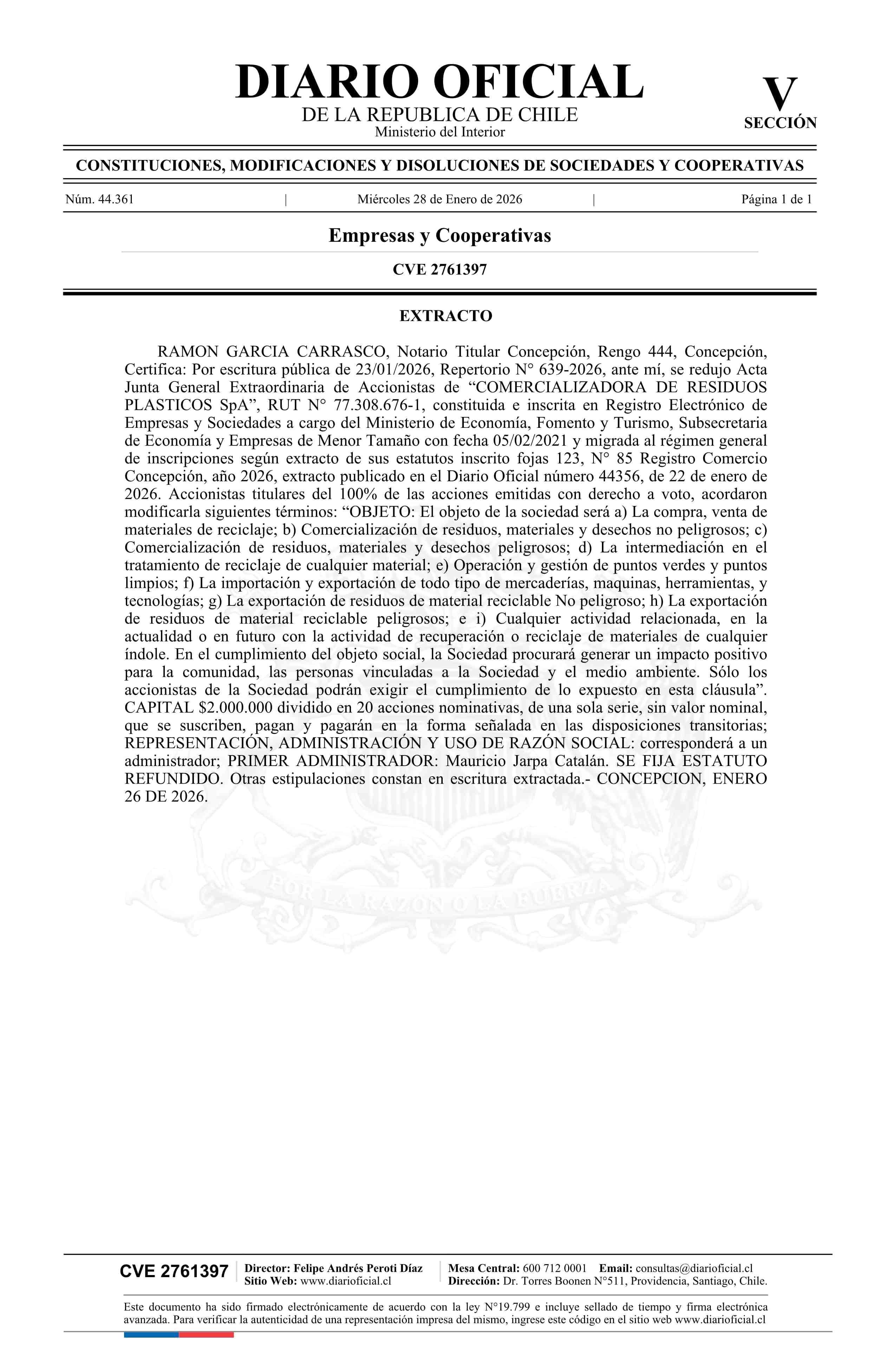 COMERCIALIZADORA DE RESIDUOS PLASTICOS SpA 77.308.676-1* 28-01-2026 Diario Oficial Edición Electrónica |