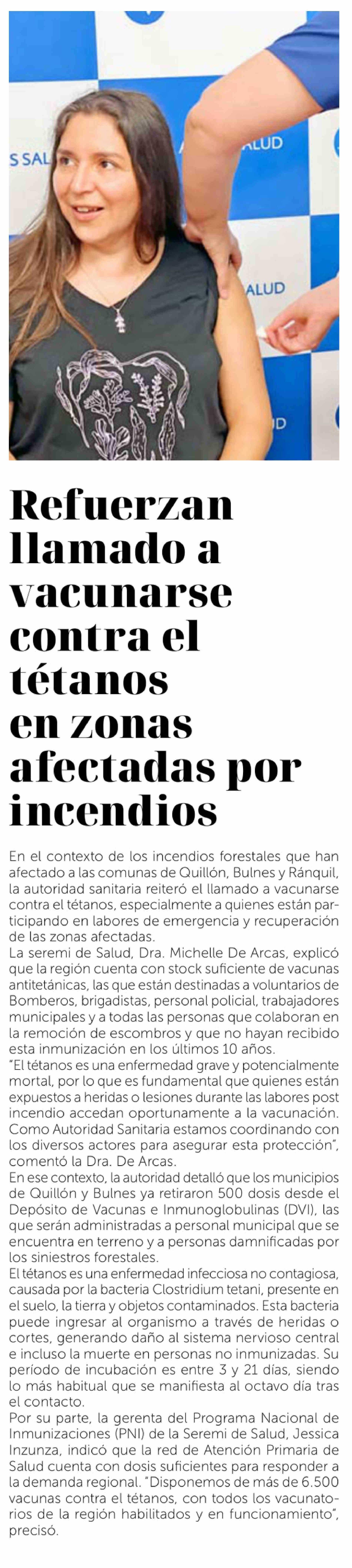Refuerzan llamado a vacunarse contra el tétanos en zonas afectadas por incendios 02-02-2026 La Discusión |
