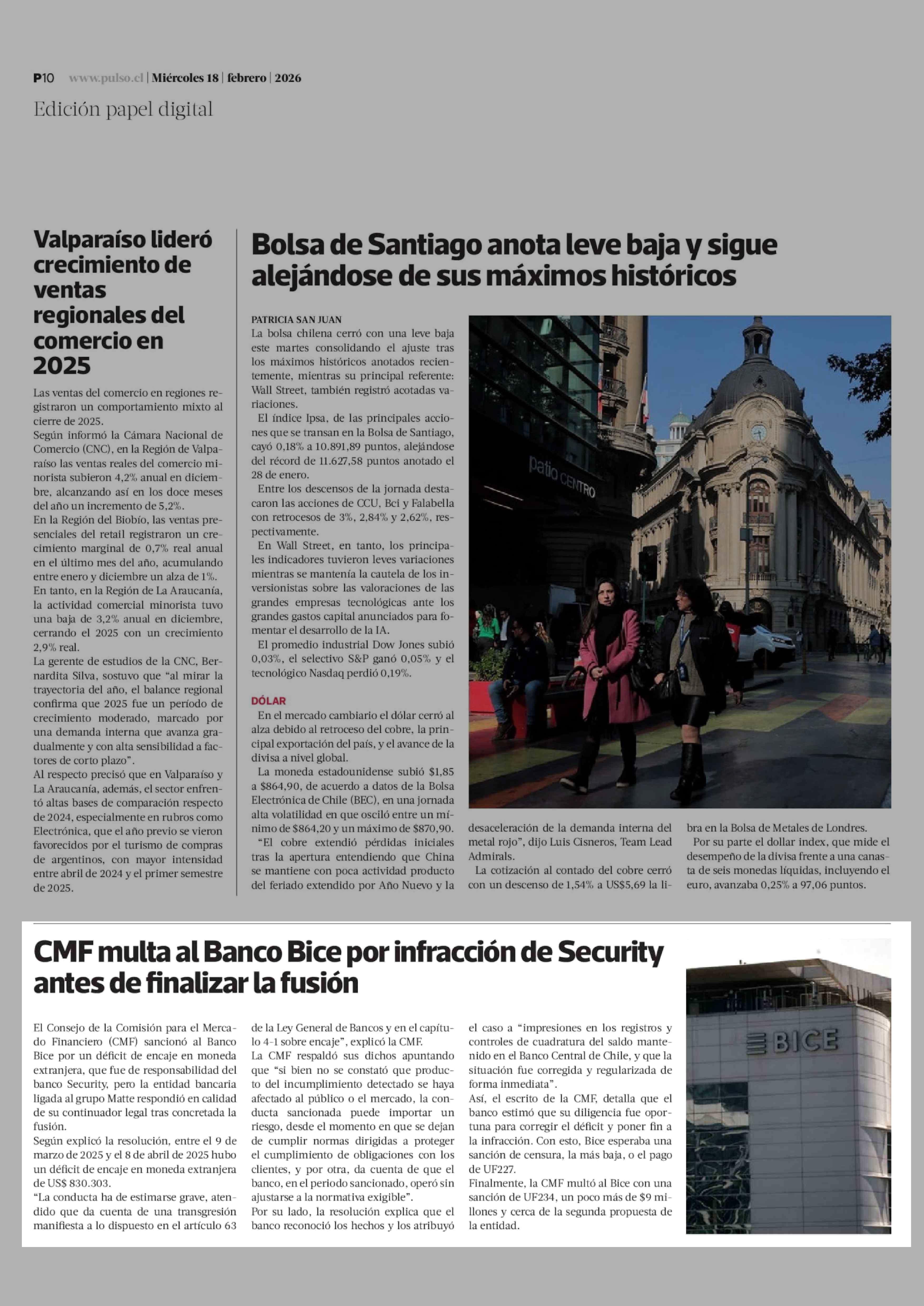 CMF multa al Banco Bice por infracción de Security antes de finalizar la fusión 18-02-2026 La Tercera |