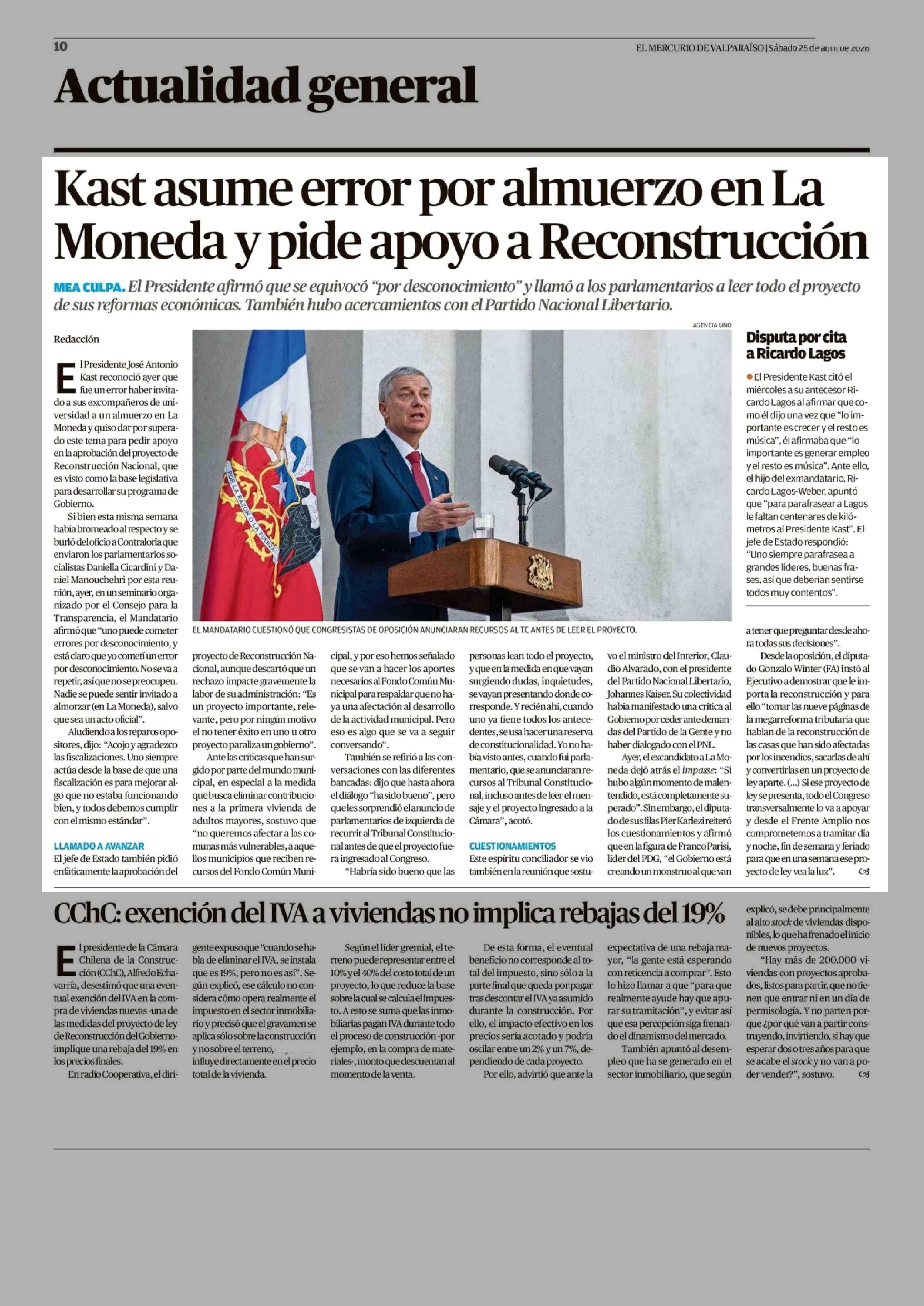 Kast asume error por almuerzo en La Moneda y pide apoyo a Reconstrucción 25-04-2026 El Mercurio de Valparaíso |