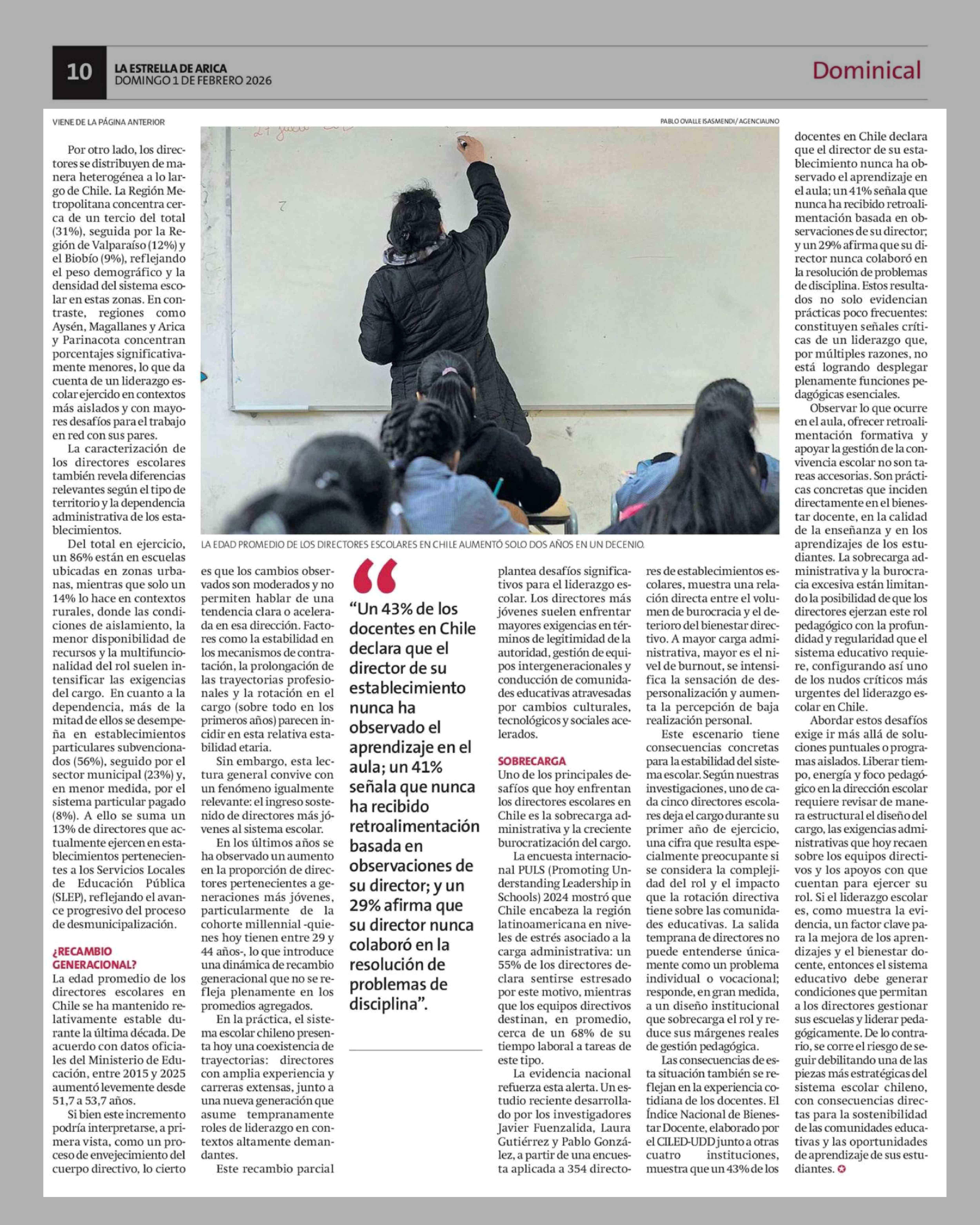 | Título: | Por otro lado, los directores se distribuyen de manera heterogénea a lo largo de Chile. La Región Metropolitana concentra cerca de un tercio del total (31%), seguida por la Región de Valparaíso (12%) y el Biobío (9%), reflejando el peso demográfico y la densidad del sistema escolar en estas zonas. E |