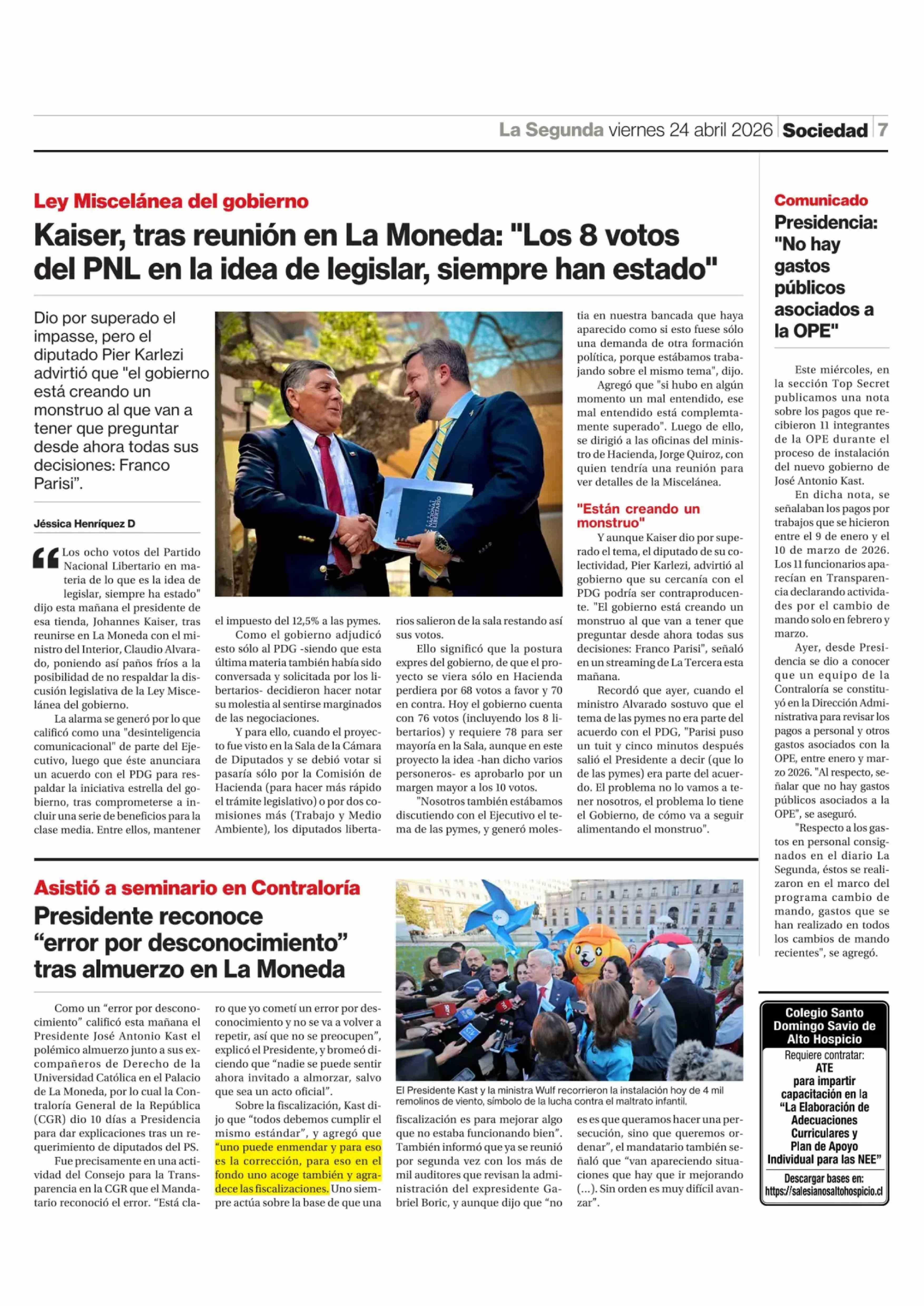 Kaiser, tras reunión en La Moneda: "Los 8 votos del PNL en la idea de legislar, siempre han estado" 24-04-2026 La Segunda |