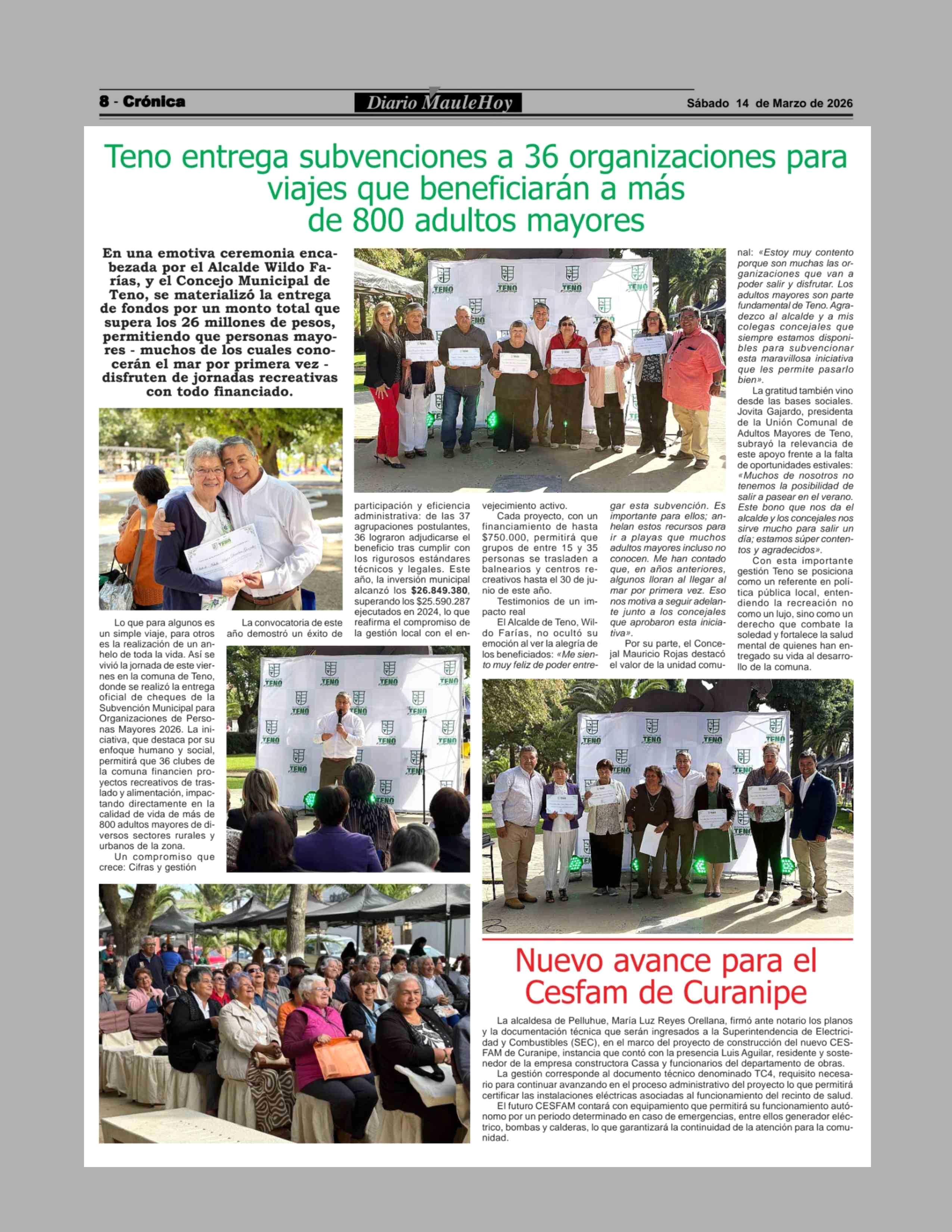 Teno entrega subvenciones a 36 organizaciones para viajes que beneficiarán a más de 800 adultos mayores 14-03-2026 Maule Hoy |