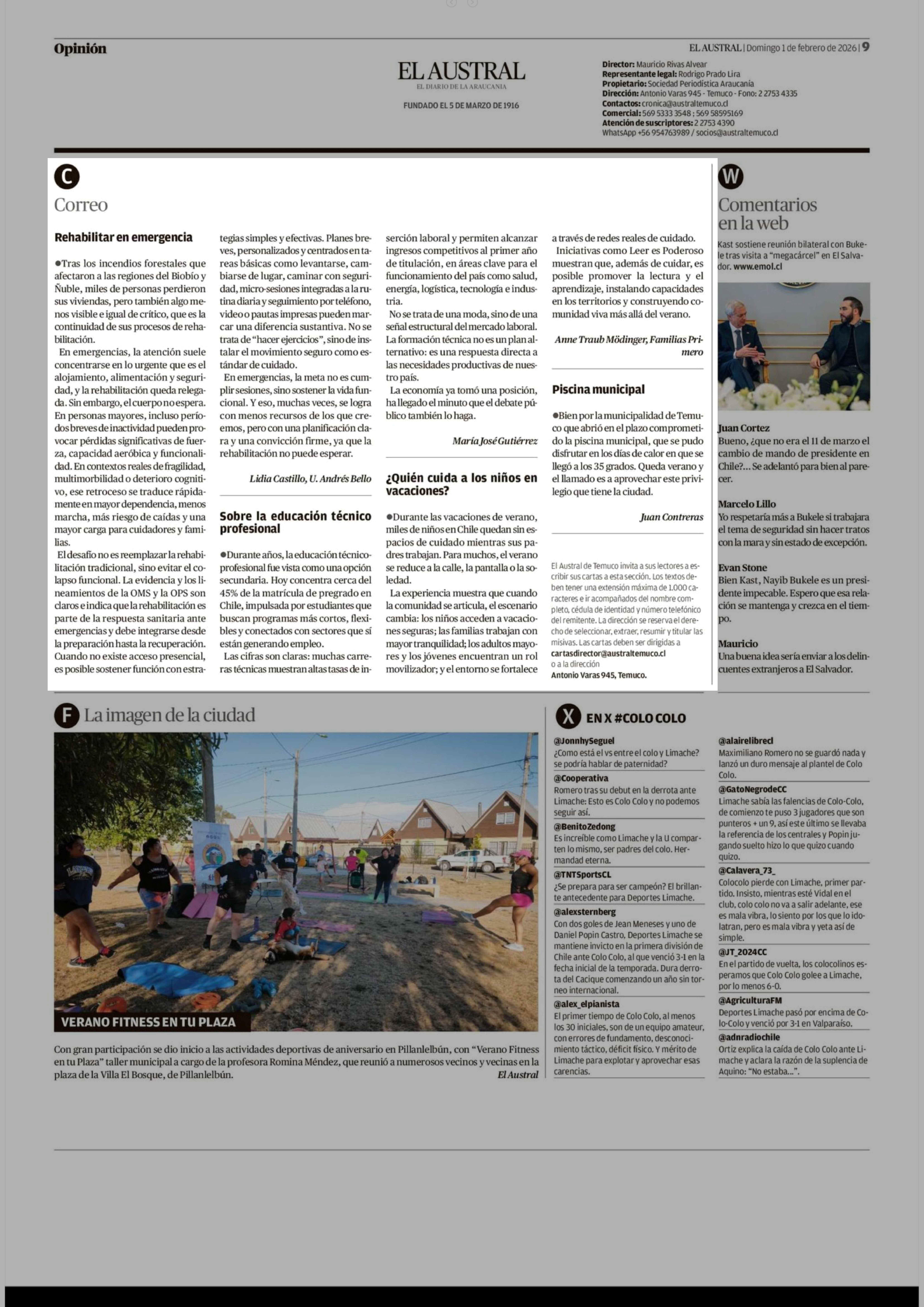 Cartas: Rehabilitar en emergencia 01-02-2026 El Austral de la Araucanía |