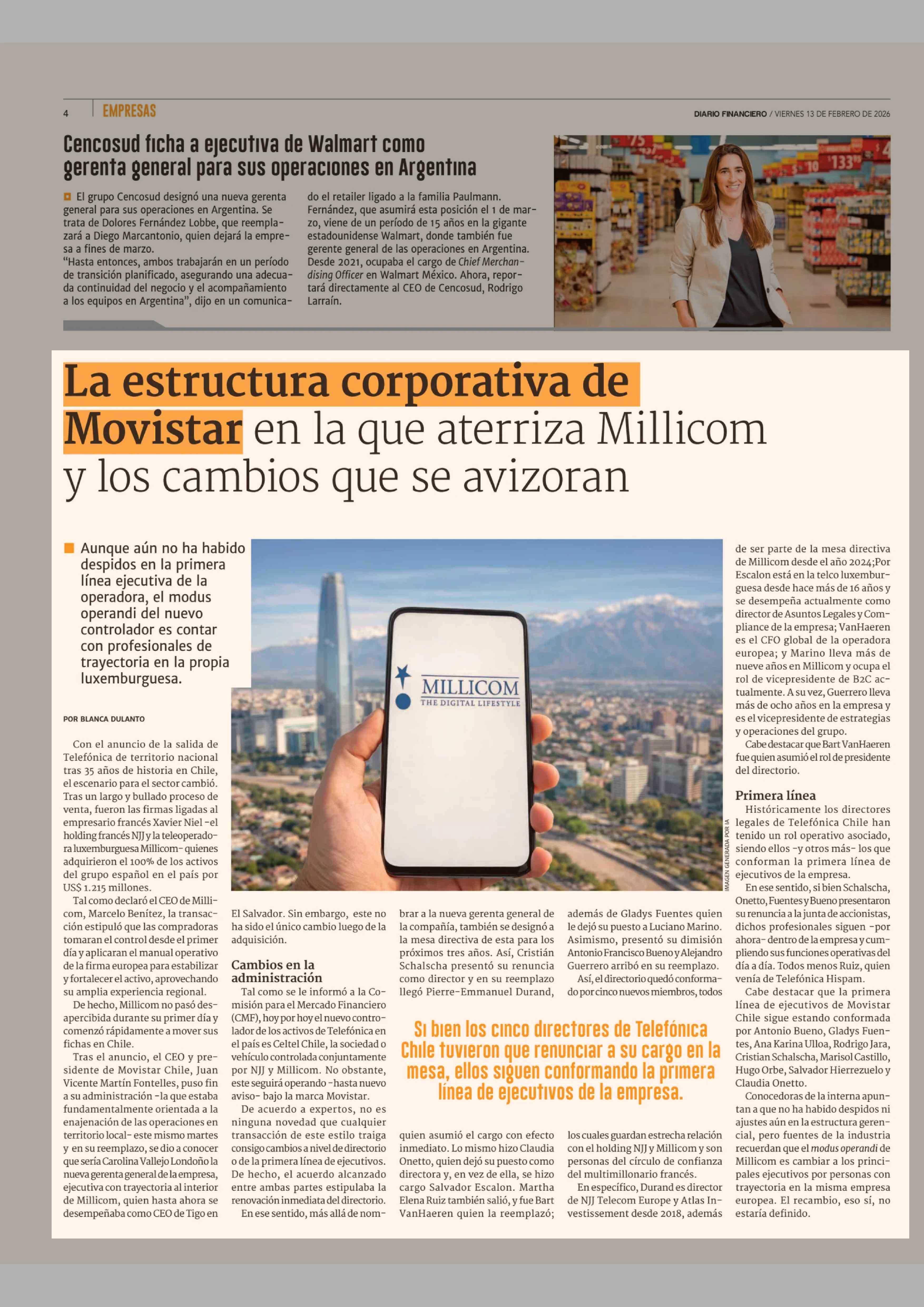 La estructura corporativa de Movistar en la que aterriza Millicom y los cambios que se avizoran 13-02-2026 Diario Financiero |