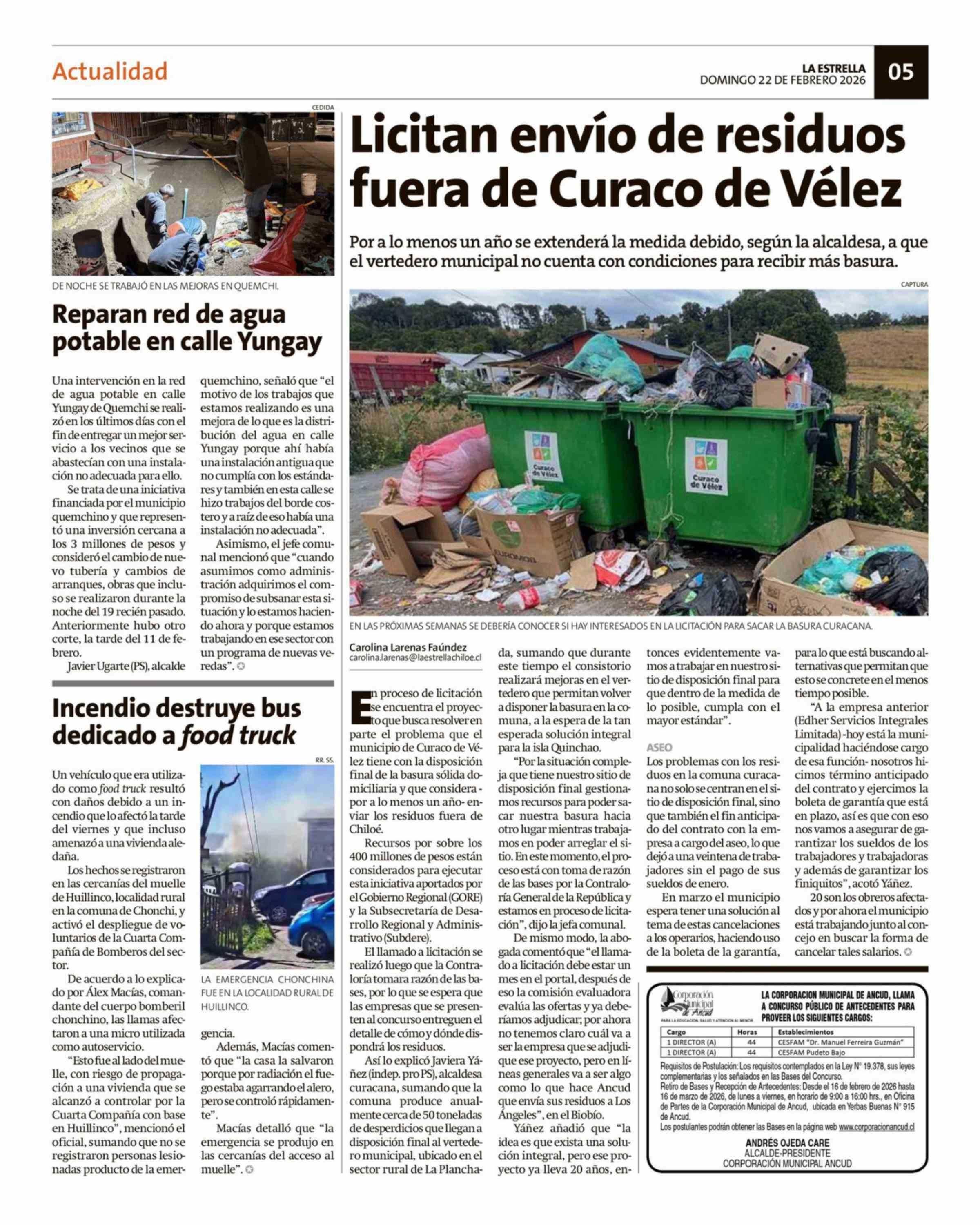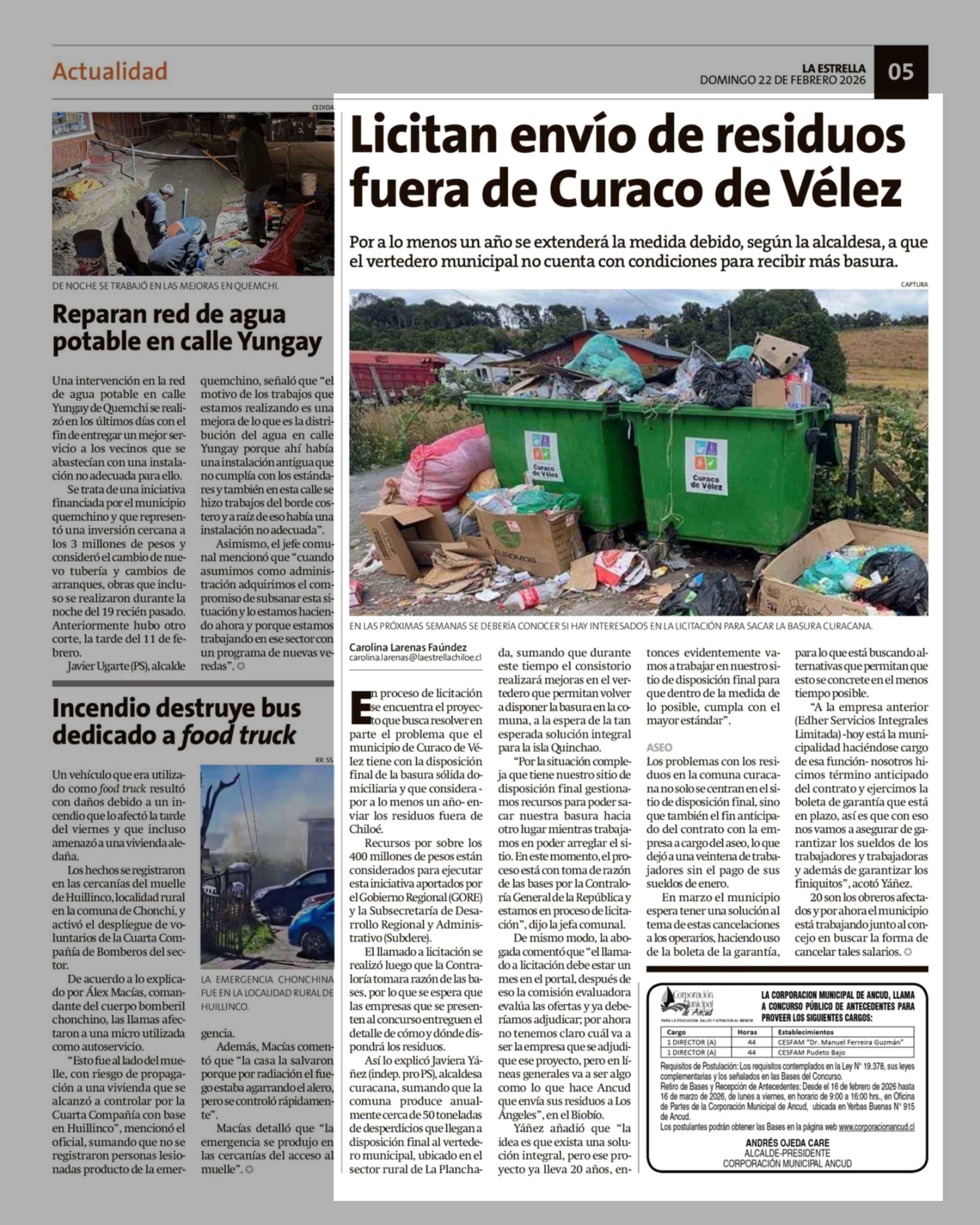 Licitan envío de residuos fuera de Curaco de Vélez 22-02-2026 La Estrella de Chiloé |