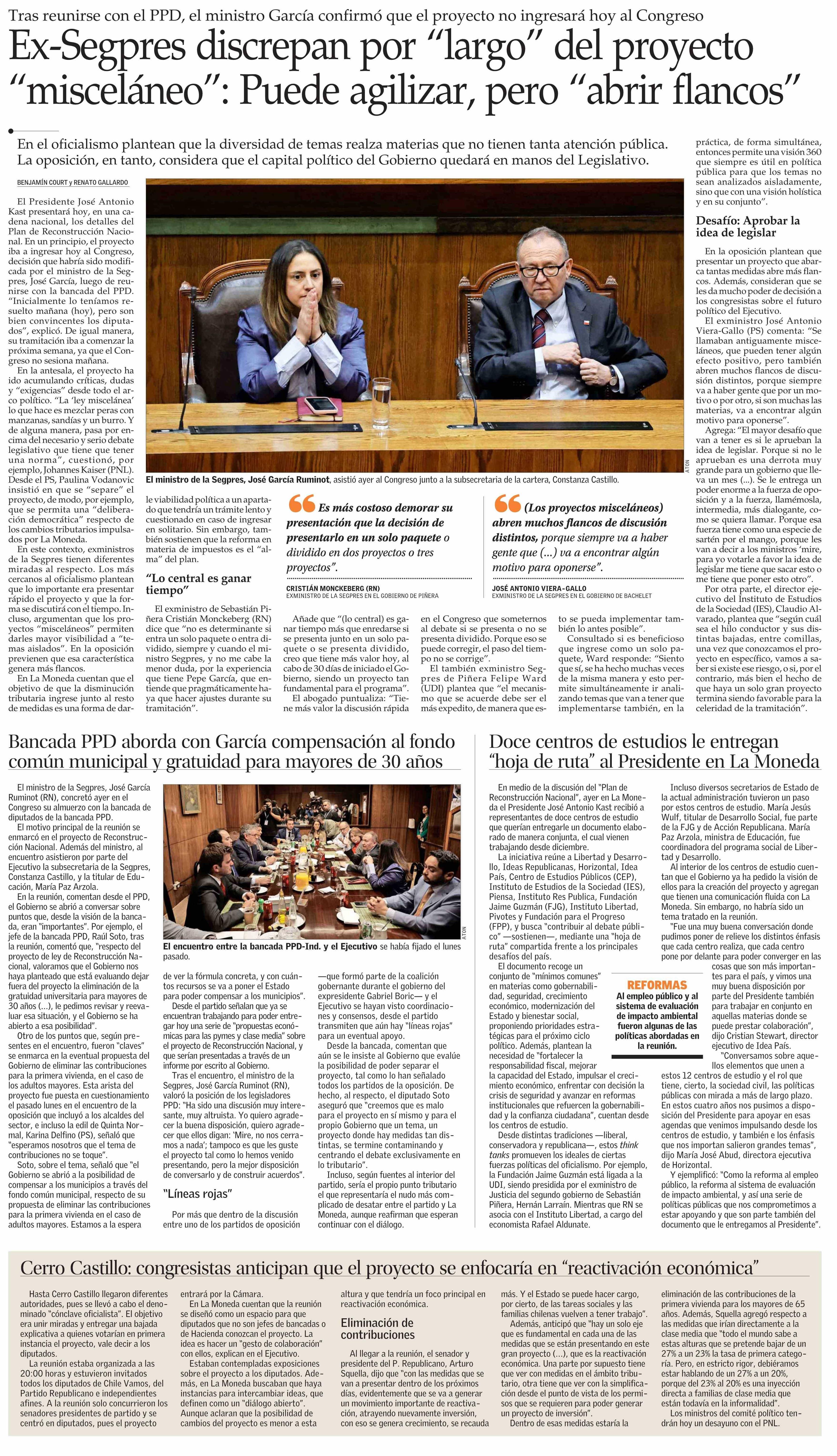 Ex-Segpres discrepan por “largo” del proyecto “misceláneo”: Puede agilizar, pero “abrir flancos” 15-04-2026 El Mercurio |