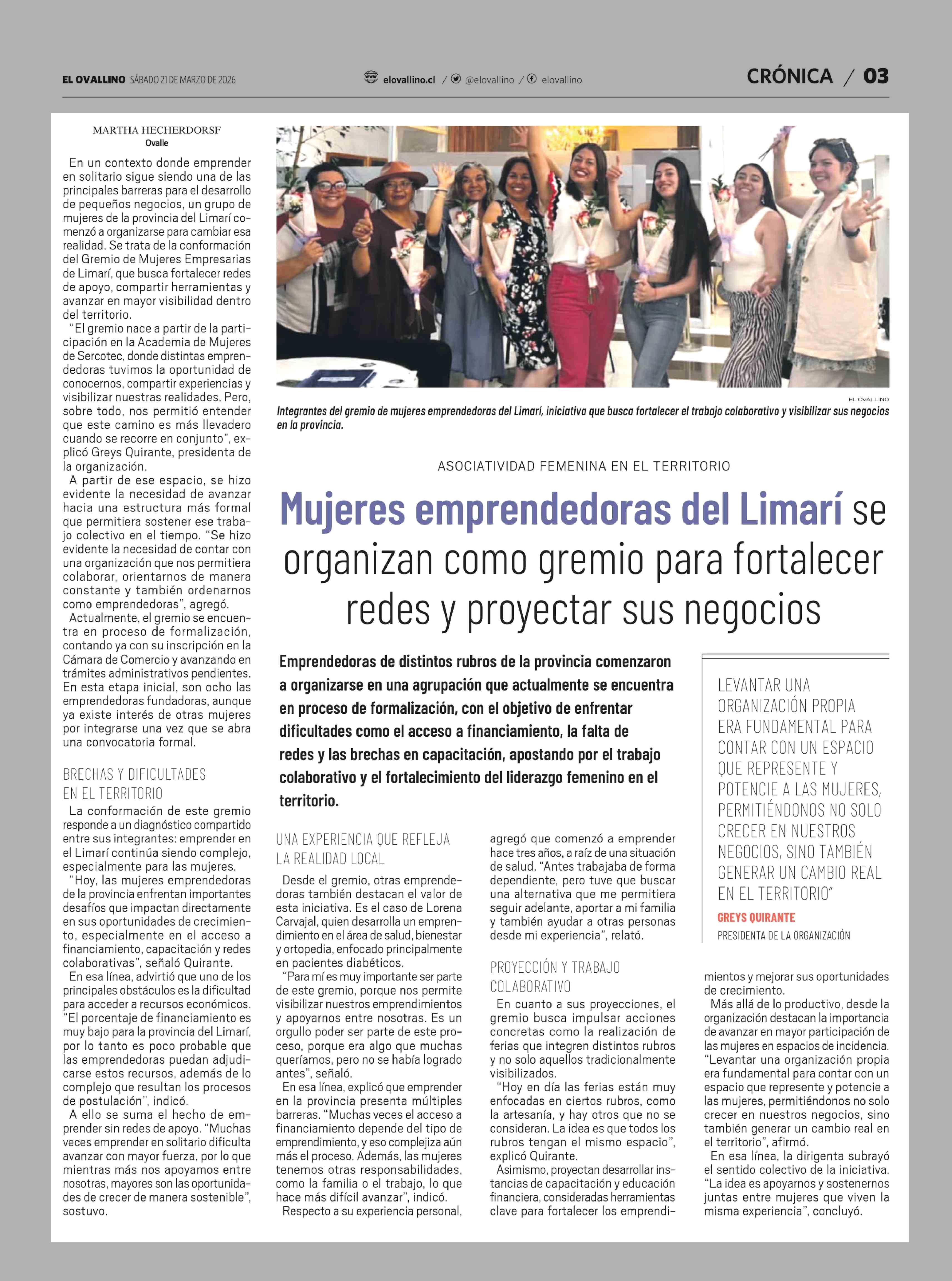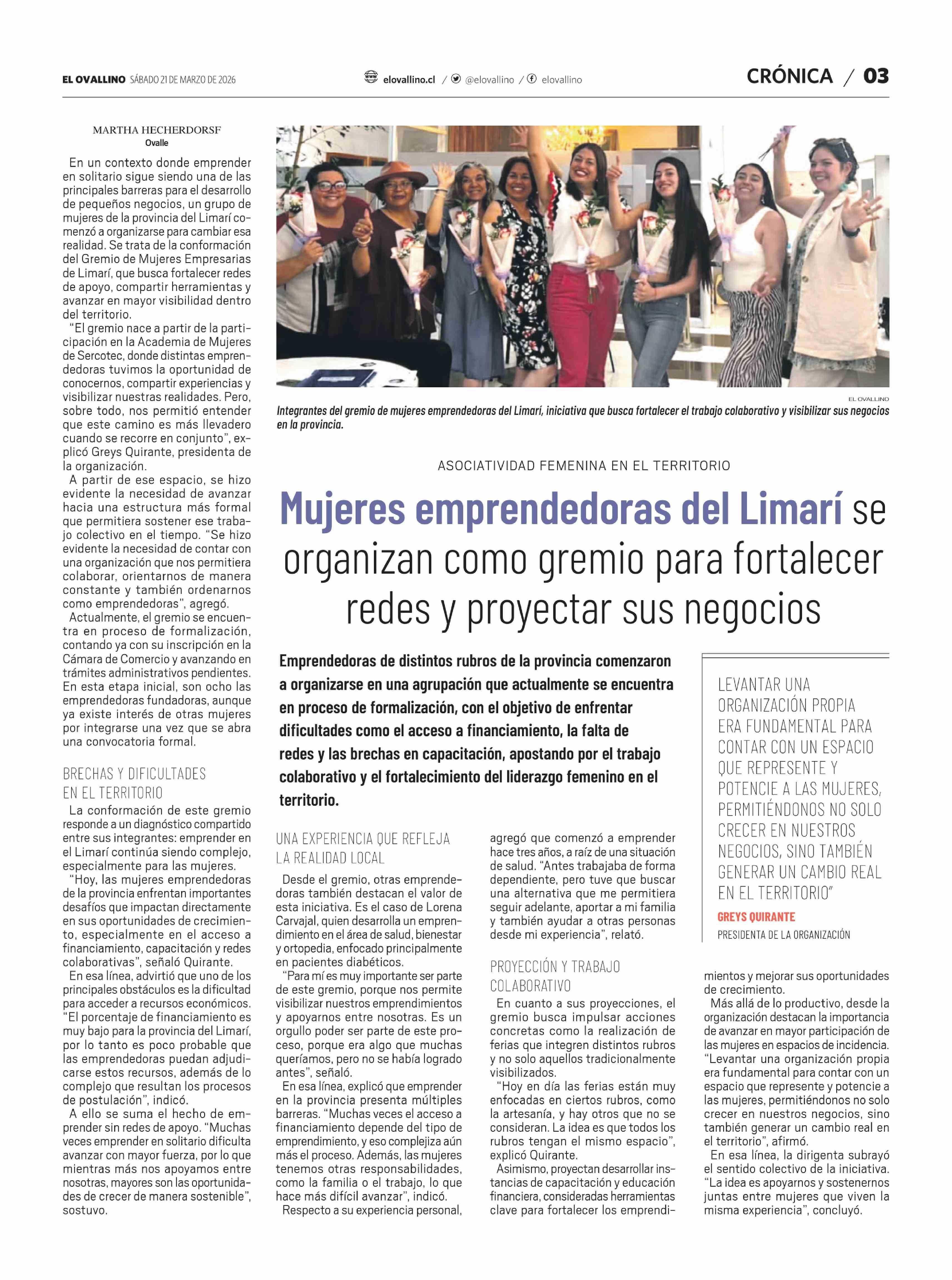 Mujeres emprendedoras del Limarí se organizan como gremio para fortalecer redes y proyectar sus negocios 21-03-2026 El Ovallino |