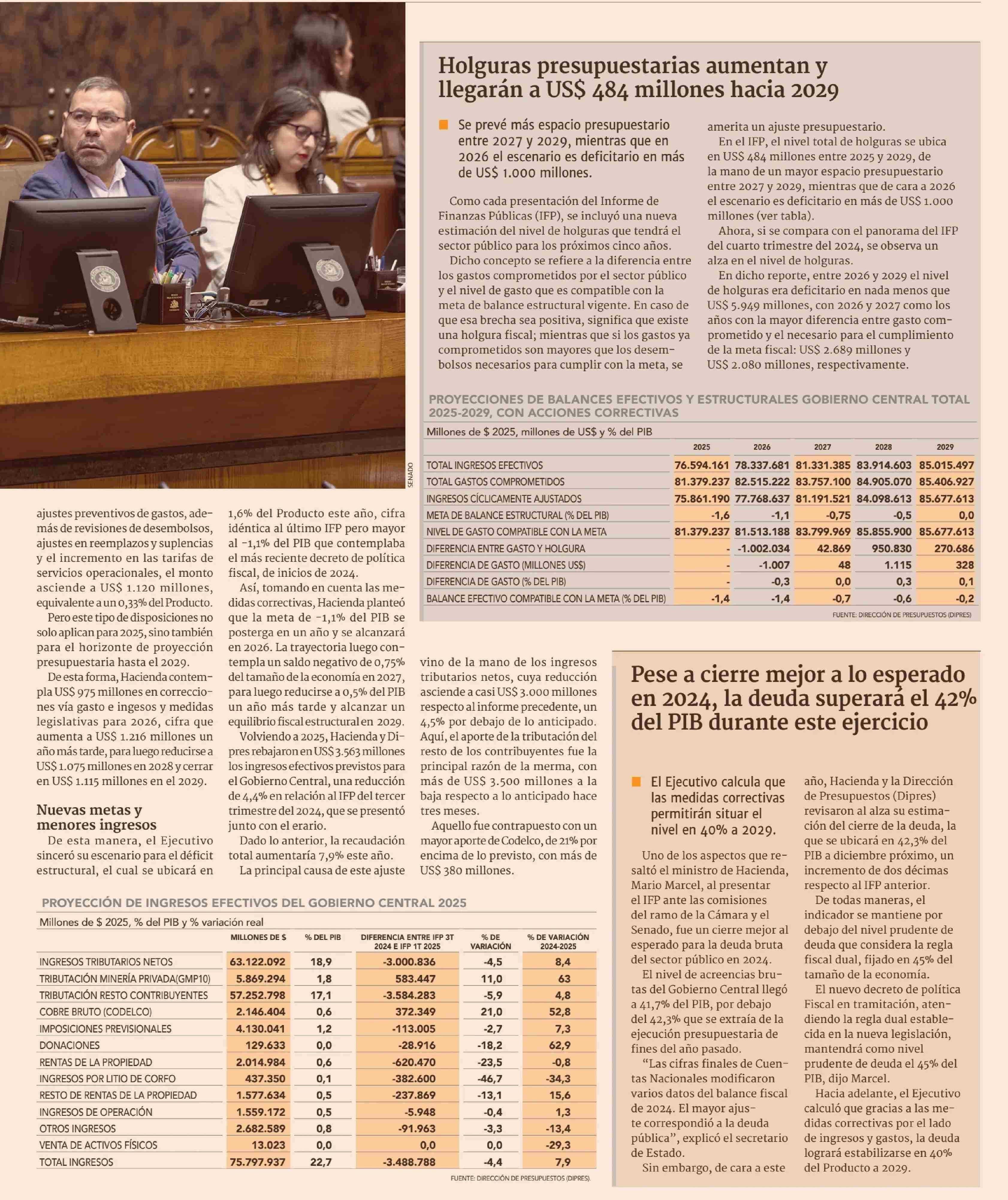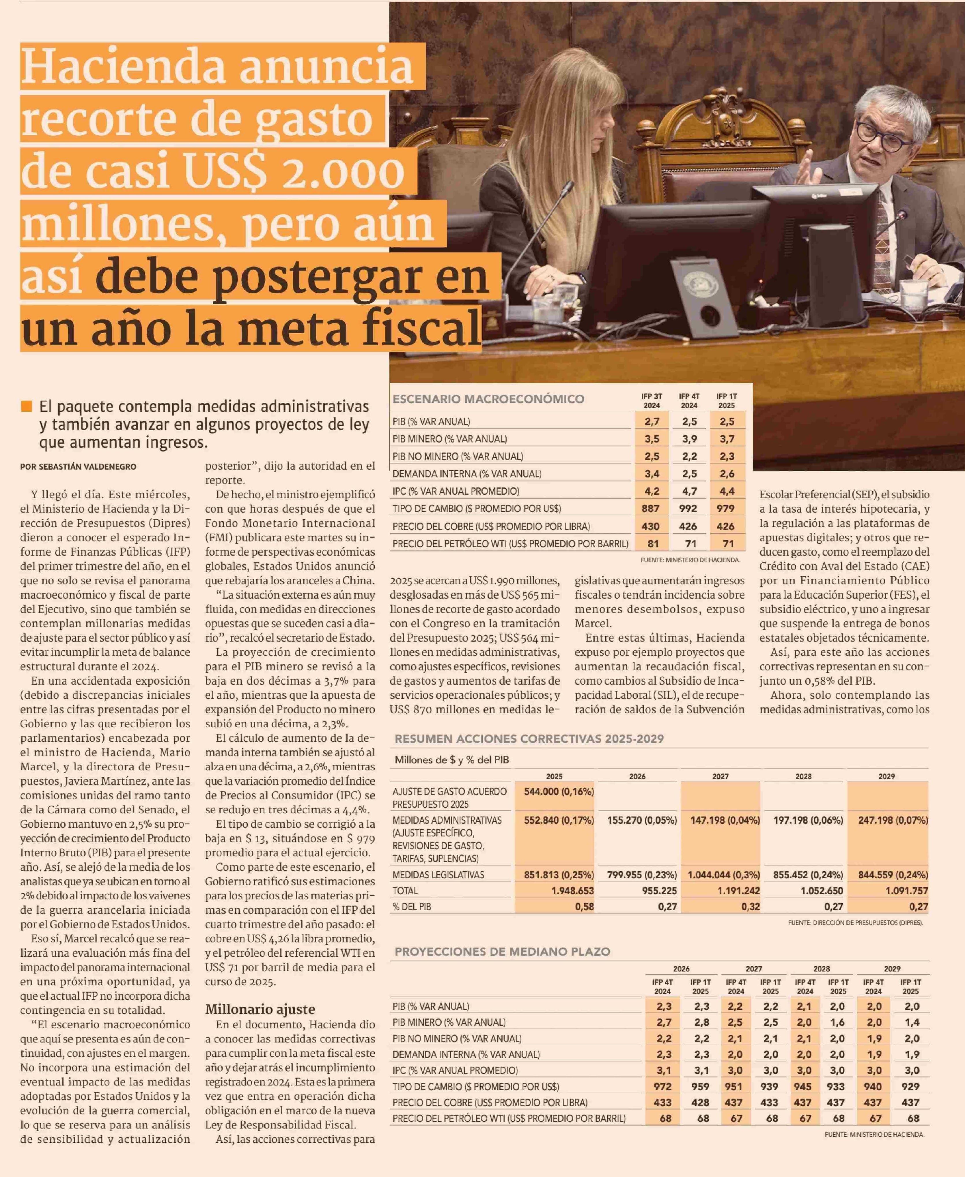 Hacienda anuncia recorte de gasto de casi US$ 2.000 millones, pero aún así debe postergar en un año la meta fiscal 24-04-2025 Diario Financiero |