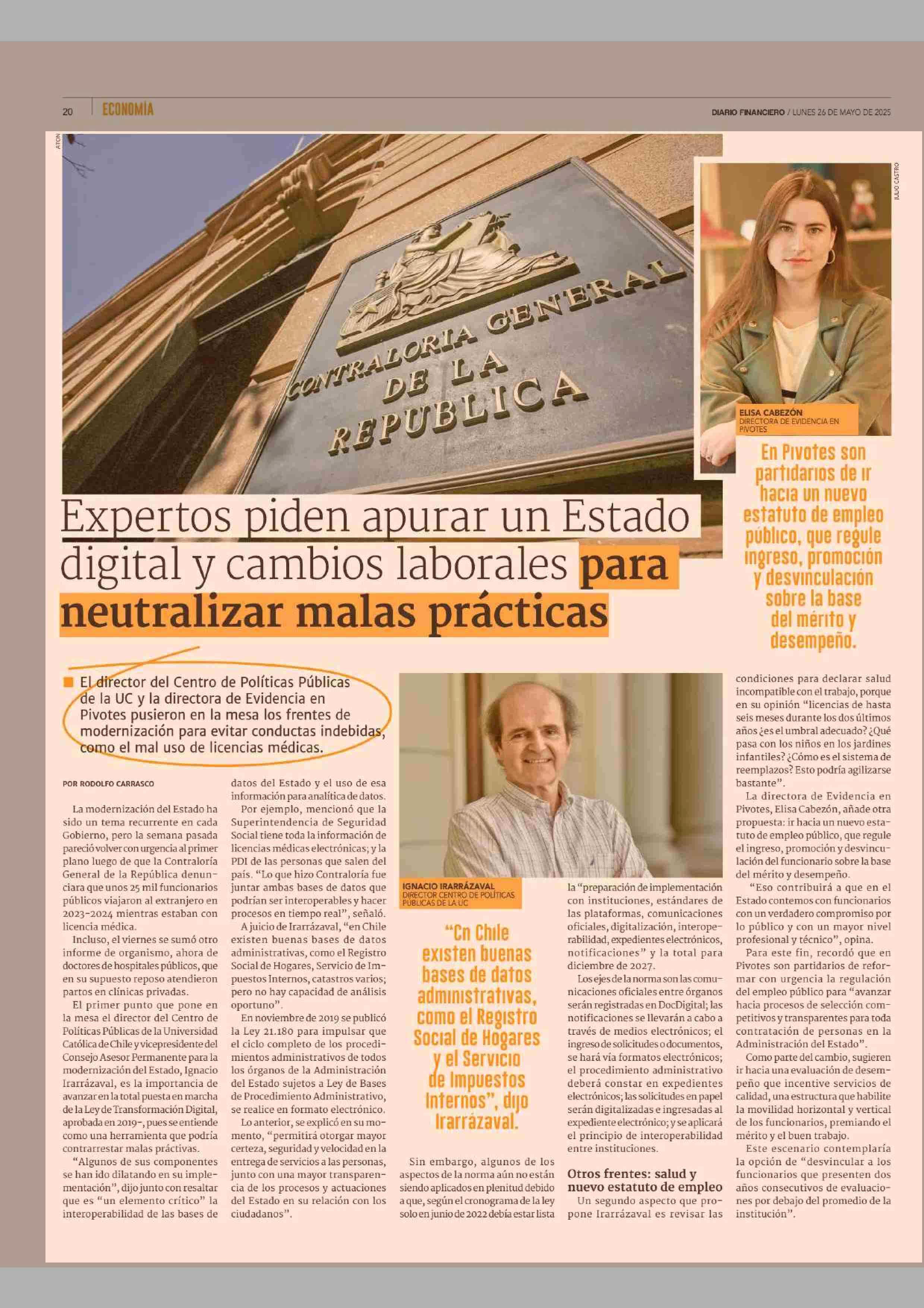 Expertos piden apurar un Estado digital y cambios laborales para neutralizar malas practicas 26-05-2025 Diario Financiero |