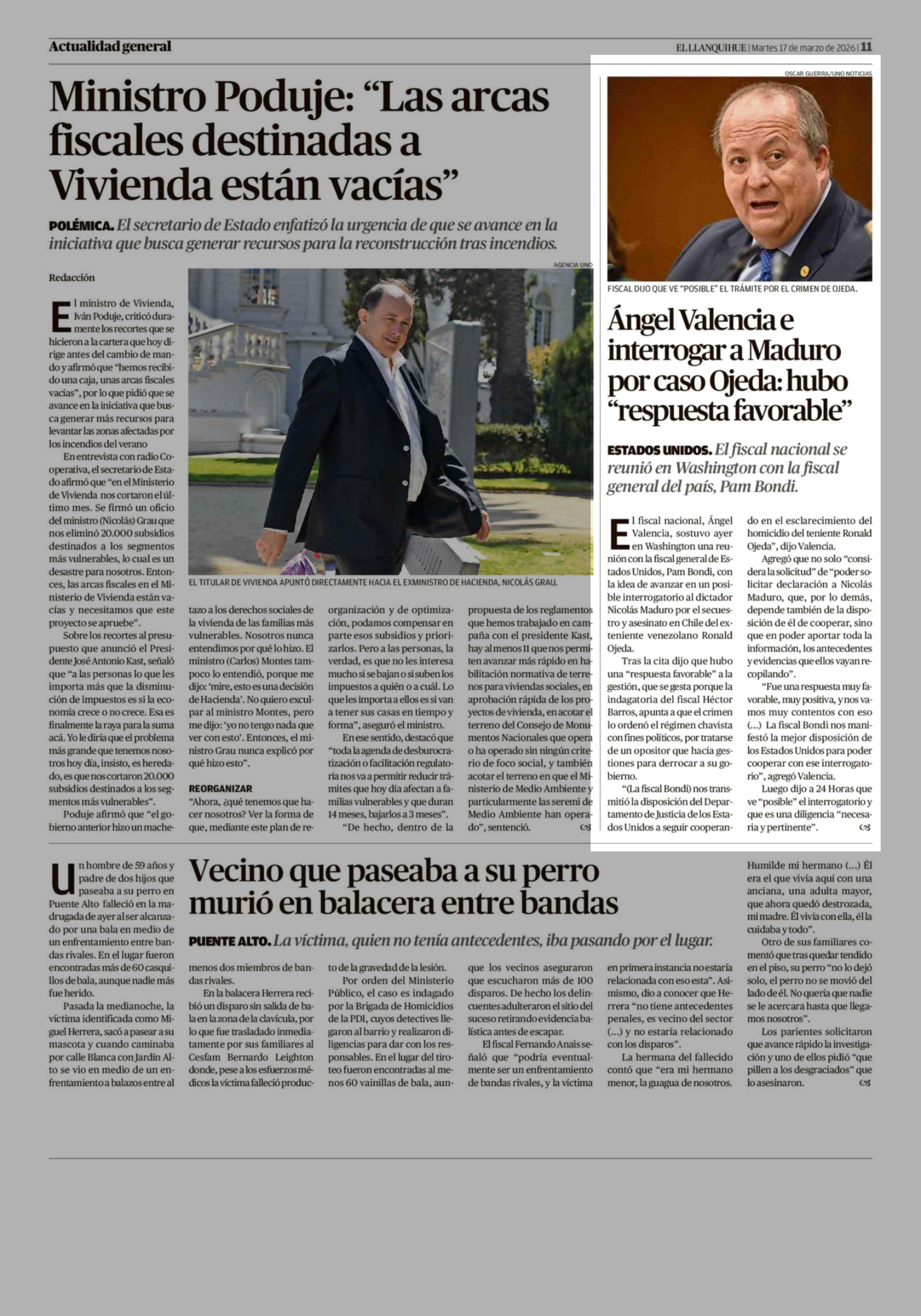 Ángel Valencia e interrogar a Maduro por caso Ojeda: hubo "respuesta favorable" 17-03-2026 El Llanquihue |