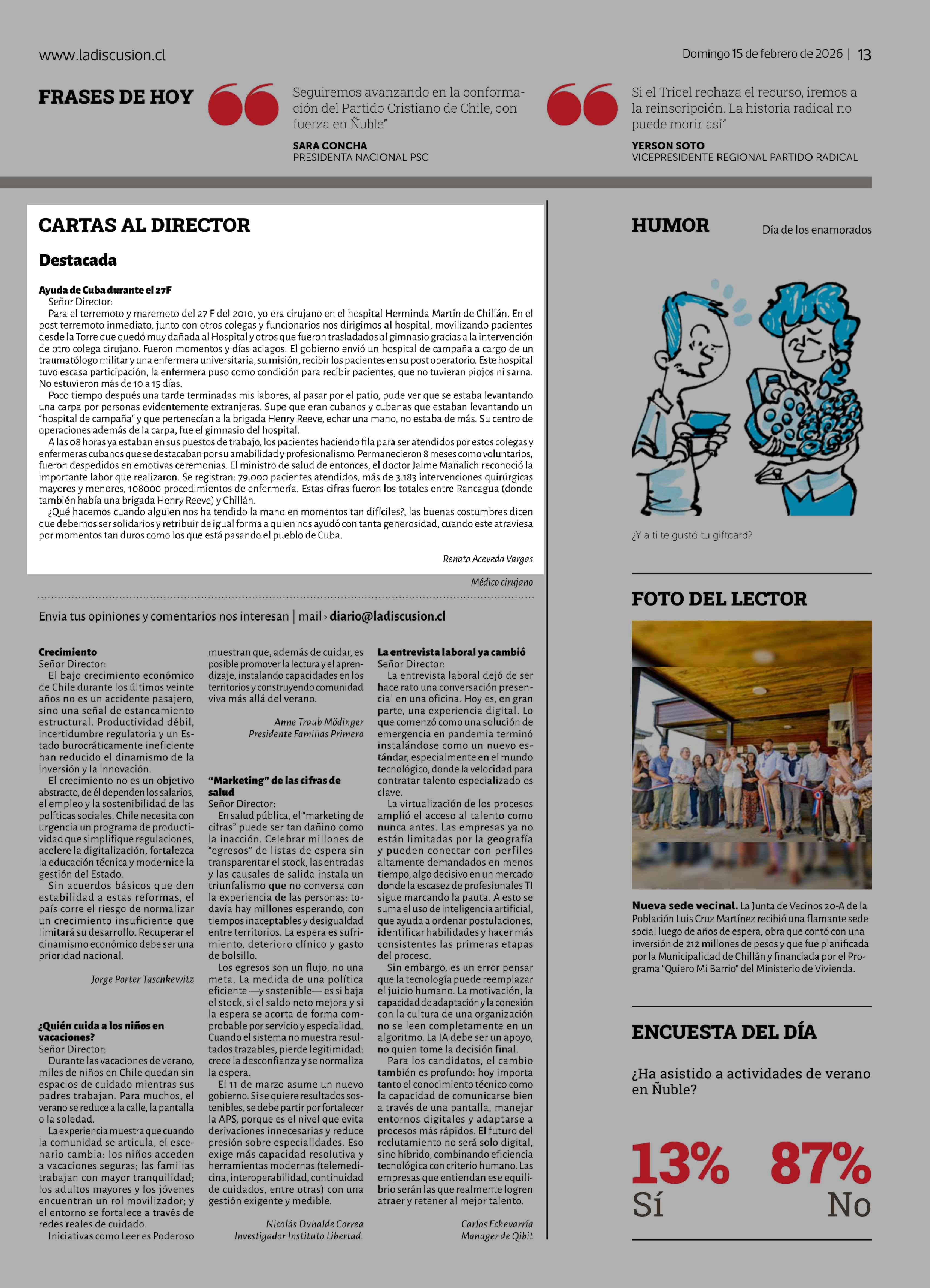 Cartas: Destacada 15-02-2026 La Discusión |