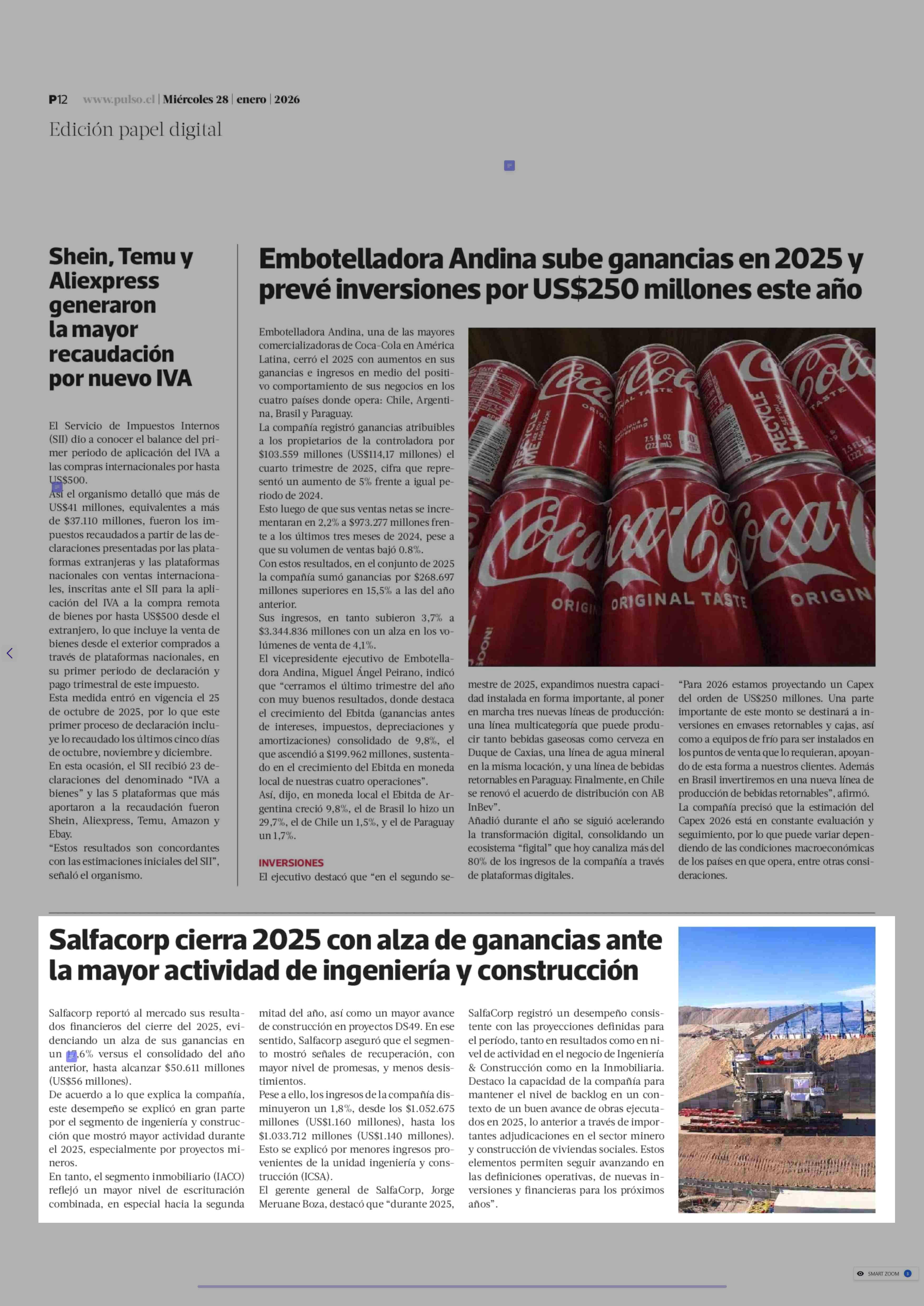 | Título: | Salfacorp cierra 2025 con alza de ganancias ante la mayor actividad de ingeniería y construcción |