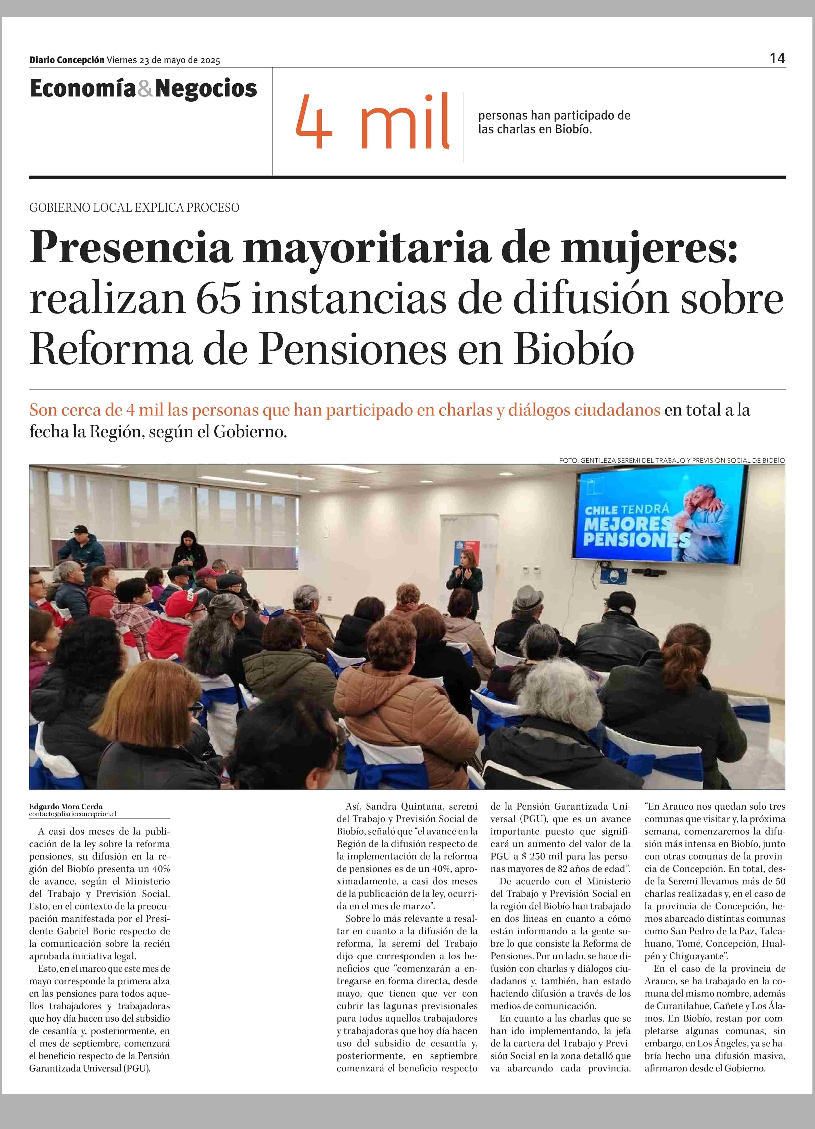 Presencia mayoritaria de mujeres: realizan 65 instancias de difusión sobre Reforma de Pensiones en Biobío 23-05-2025 Diario Concepción |