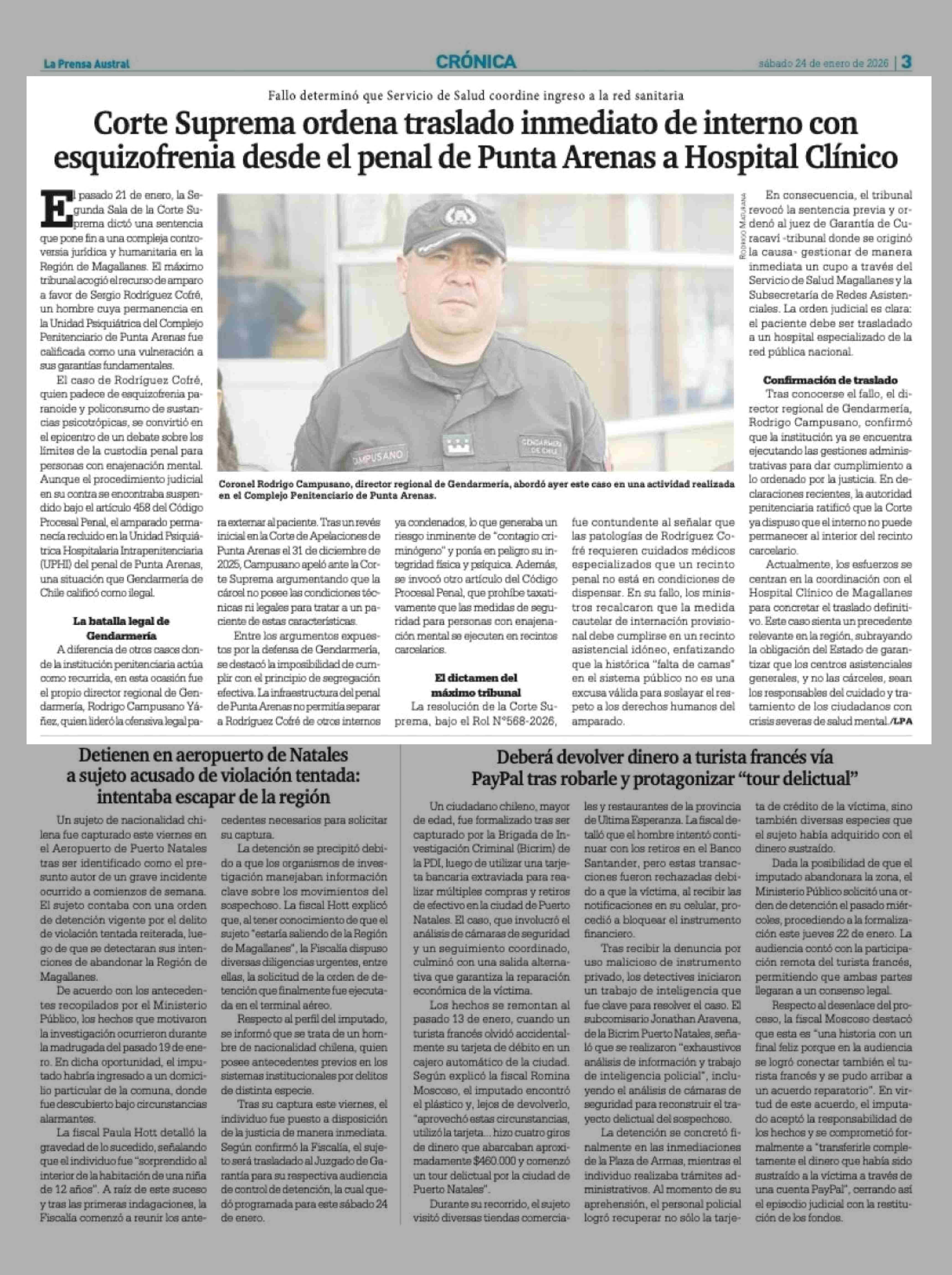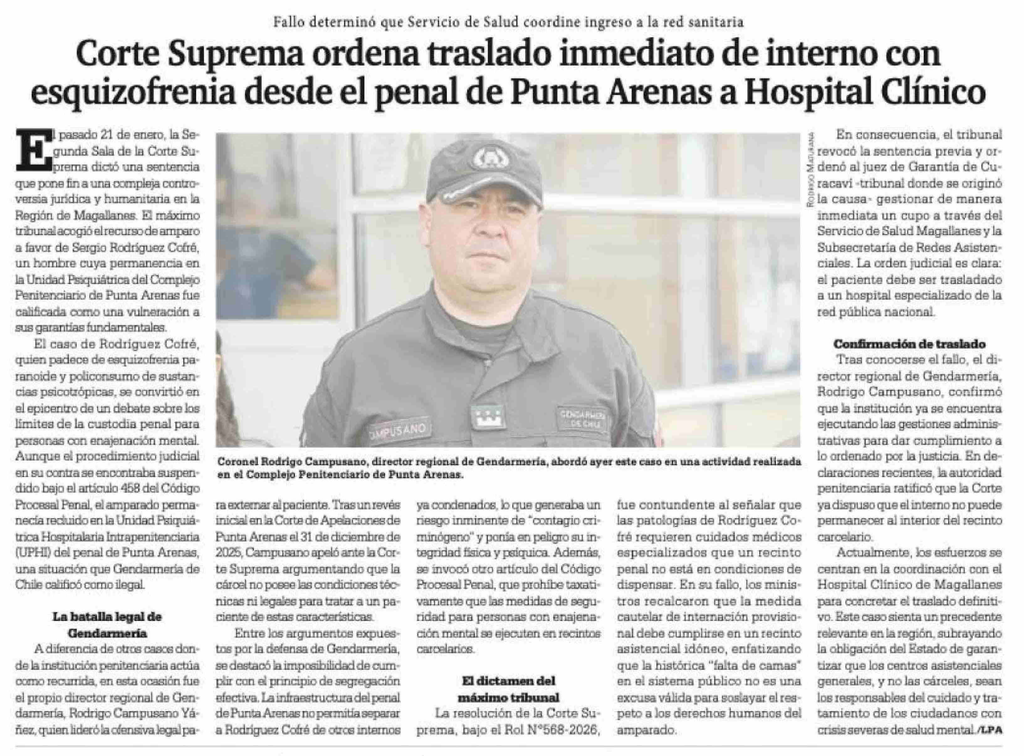 Título: Corte Suprema ordena traslado inmediato de interno con esquizofrenia desde el penal de Punta Arenas a Hospital Clínico