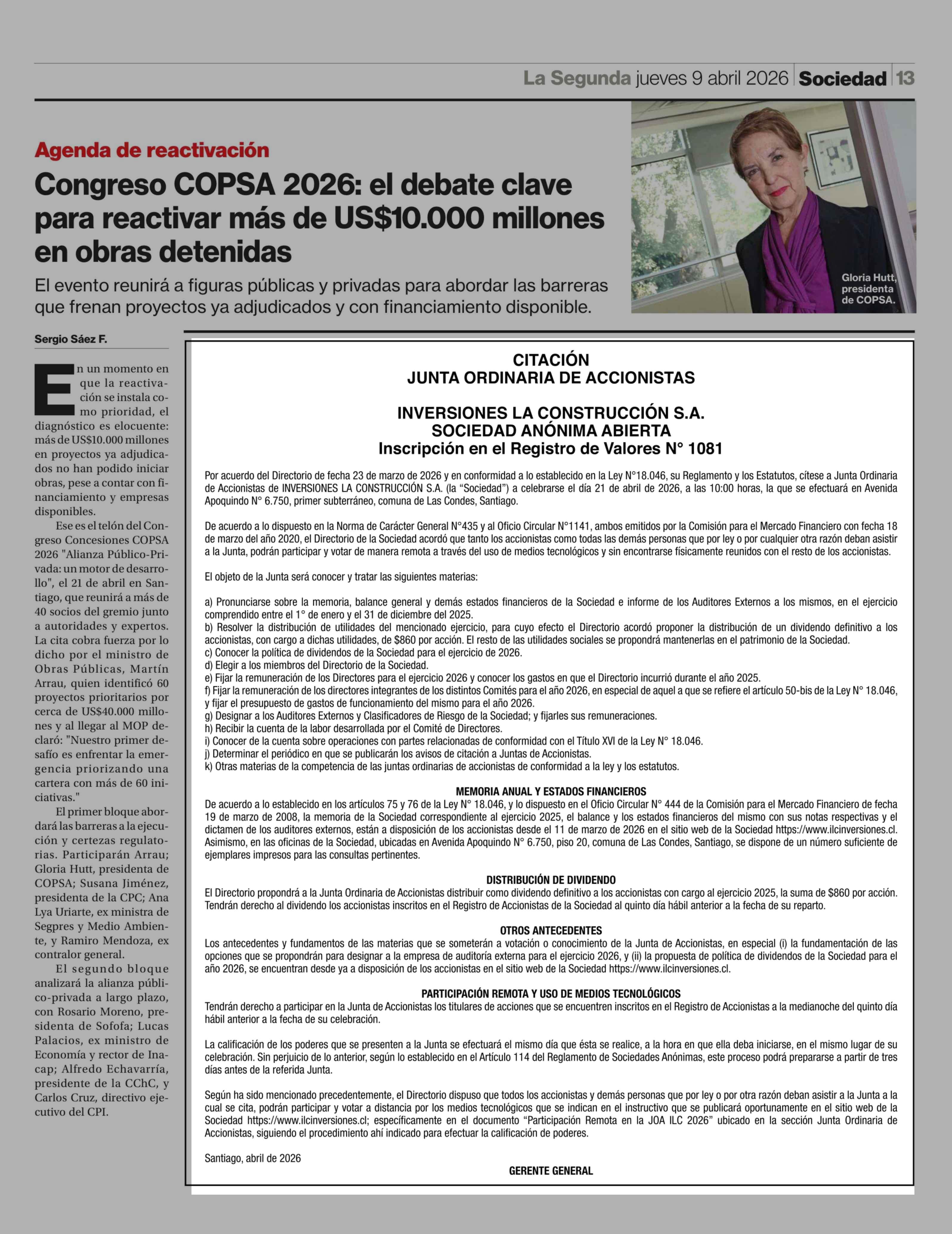 Título: CITACIÓN JUNTA ORDINARIA DE ACCIONISTAS INVERSIONES LA CONSTRUCCIÓN S.A. SOCIEDAD ANÓNIMA ABIERTA