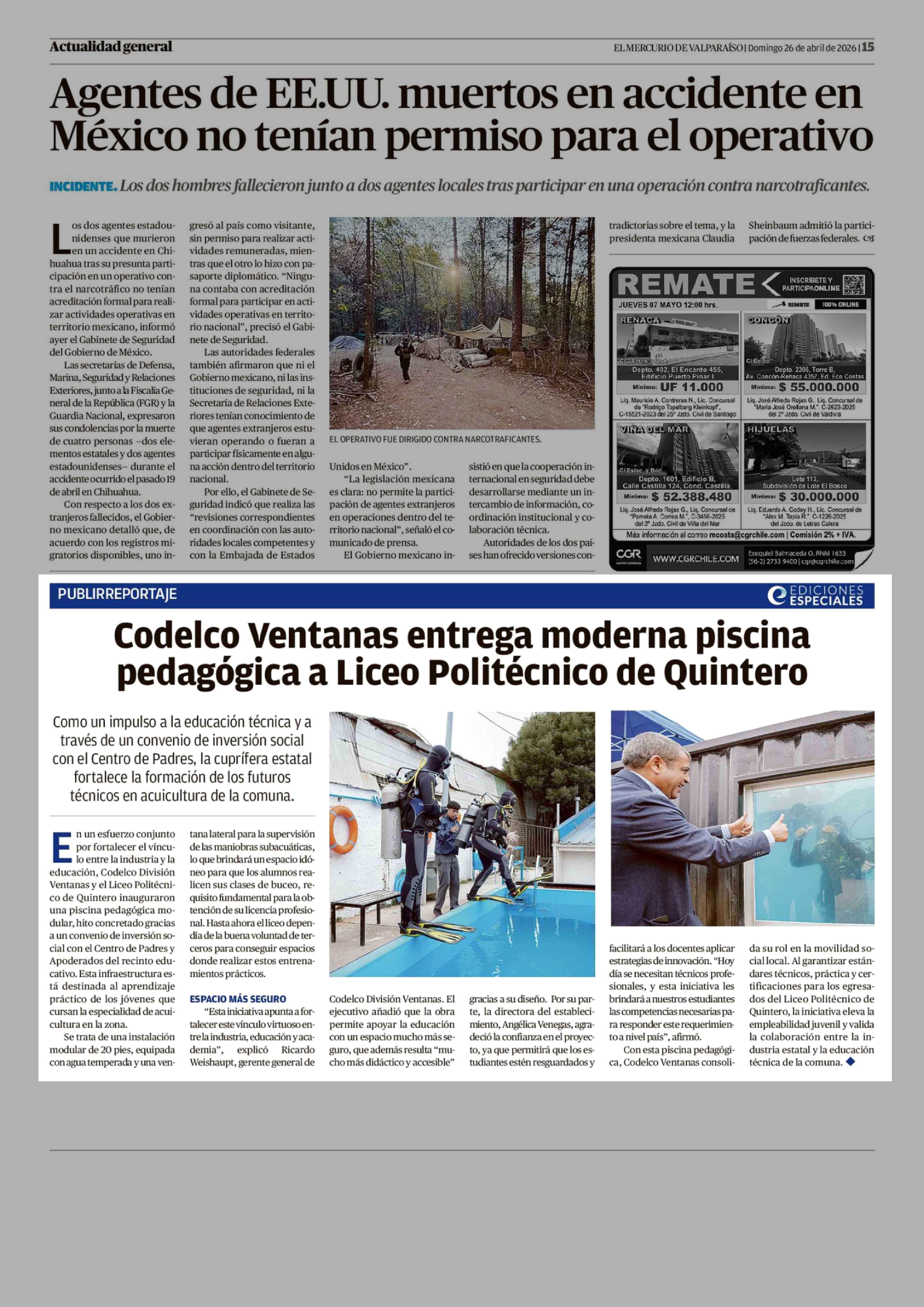Codelco Ventanas entrega moderna piscina pedagógica a Liceo Politécnico de Quintero 26-04-2026 El Mercurio de Valparaíso |