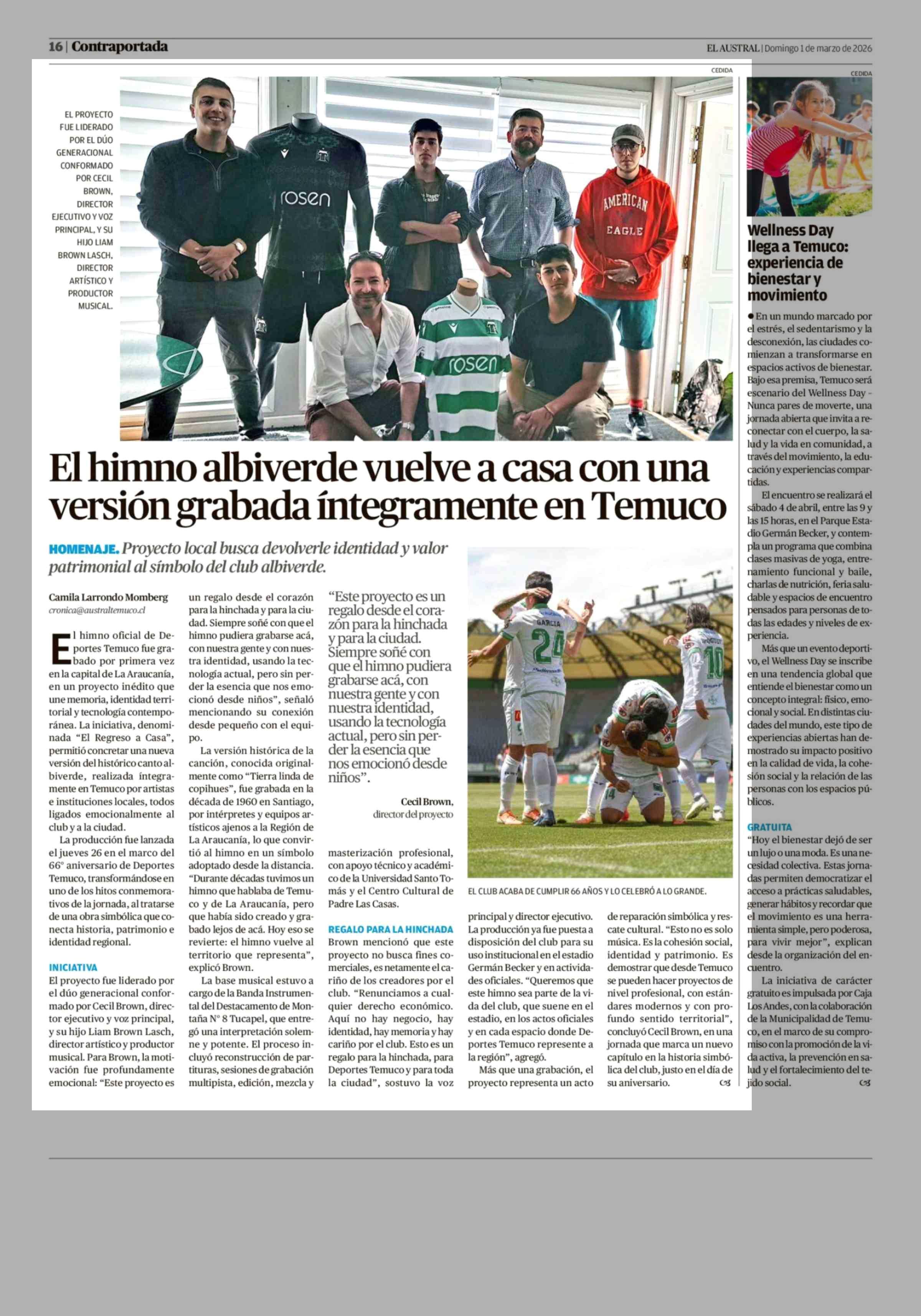 El himno albiverde vuelve a casa con una versión grabada íntegramente en Temuco 01-03-2026 El Austral de la Araucanía |