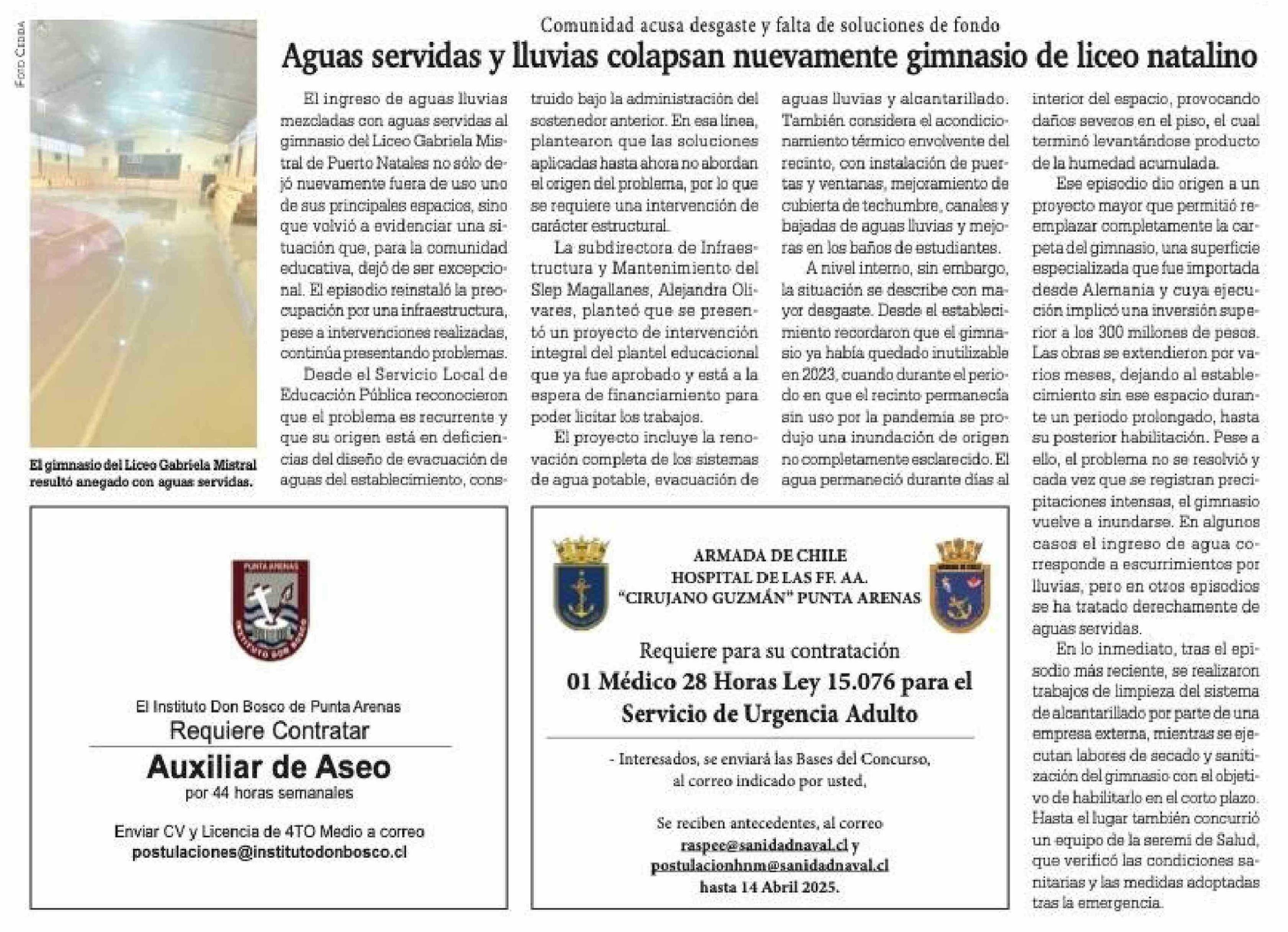 Aguas servidas y lluvias colapsan nuevamente gimnasio de liceo natalino 09-04-2026 La Prensa Austral |