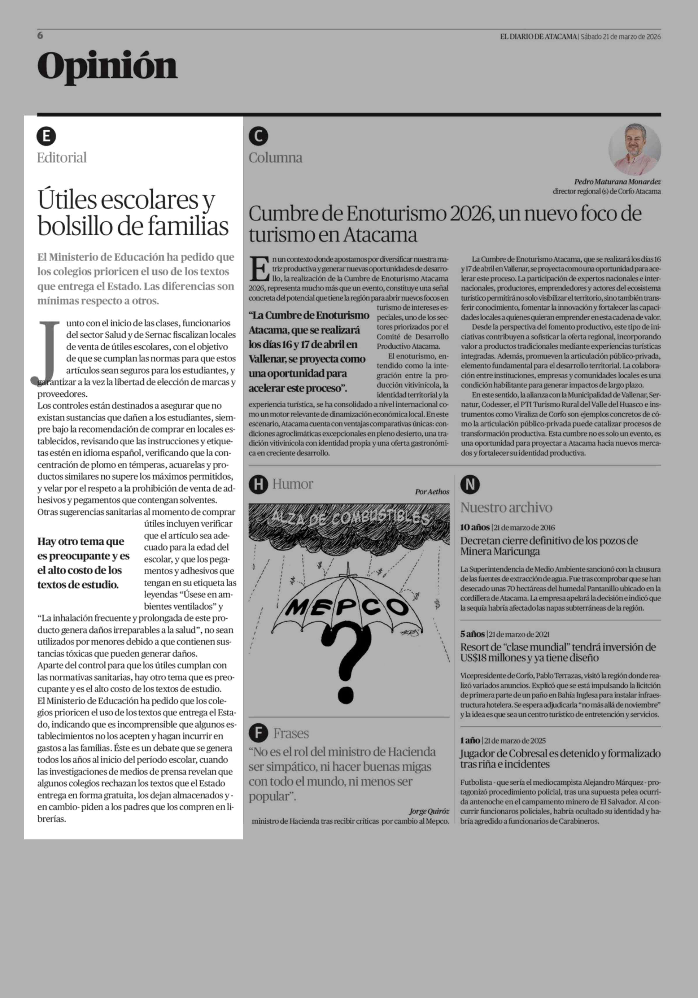 Editorial: Útiles escolares y bolsillo de familias 21-03-2026 El Diario de Atacama |