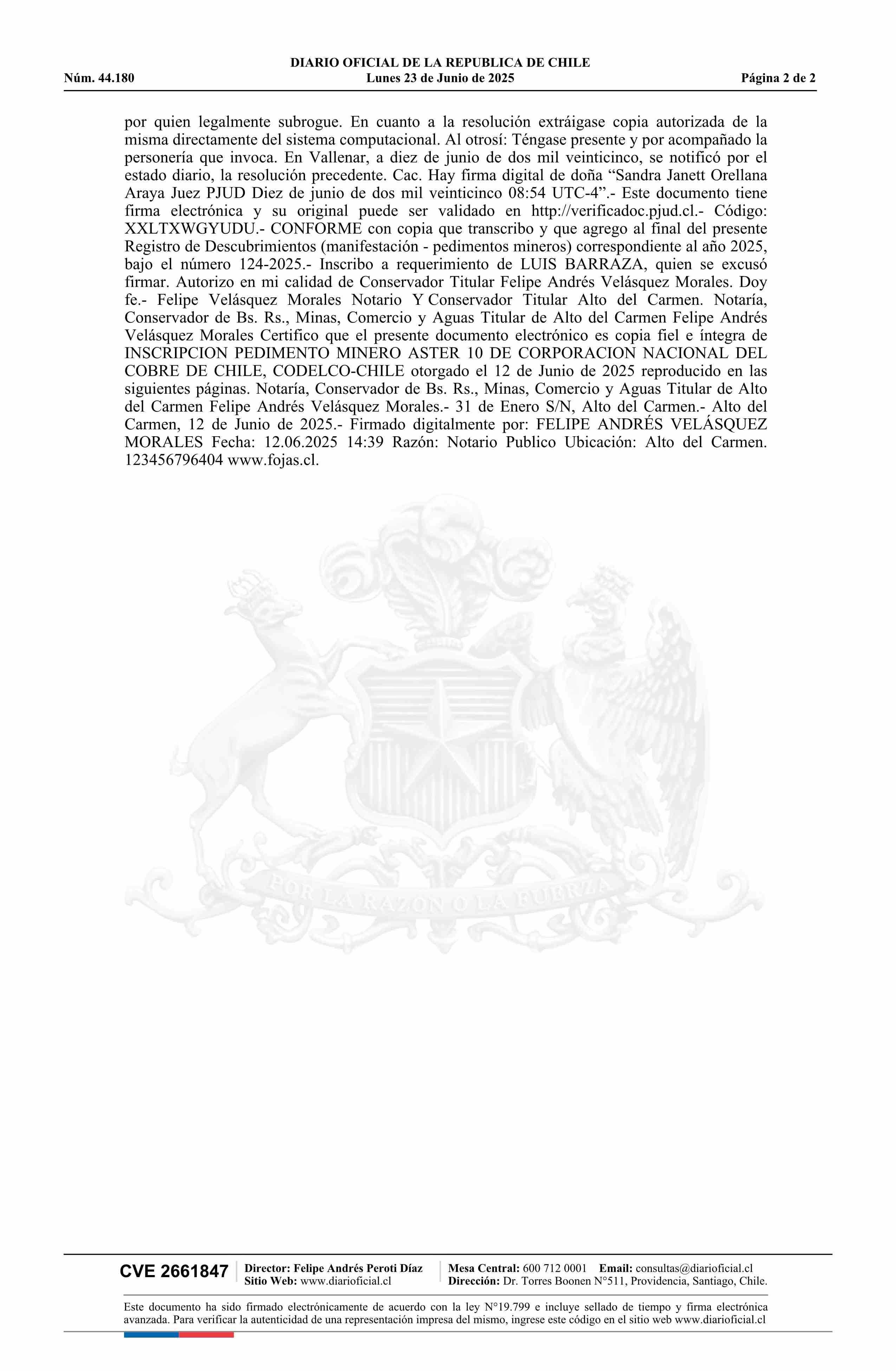 ASTER 10 / Corporación Nacional del Cobre de Chile 23-06-2025 DIARIO OFICIAL CHILE - BOLETÍN OFICIAL DE MINERÍA |