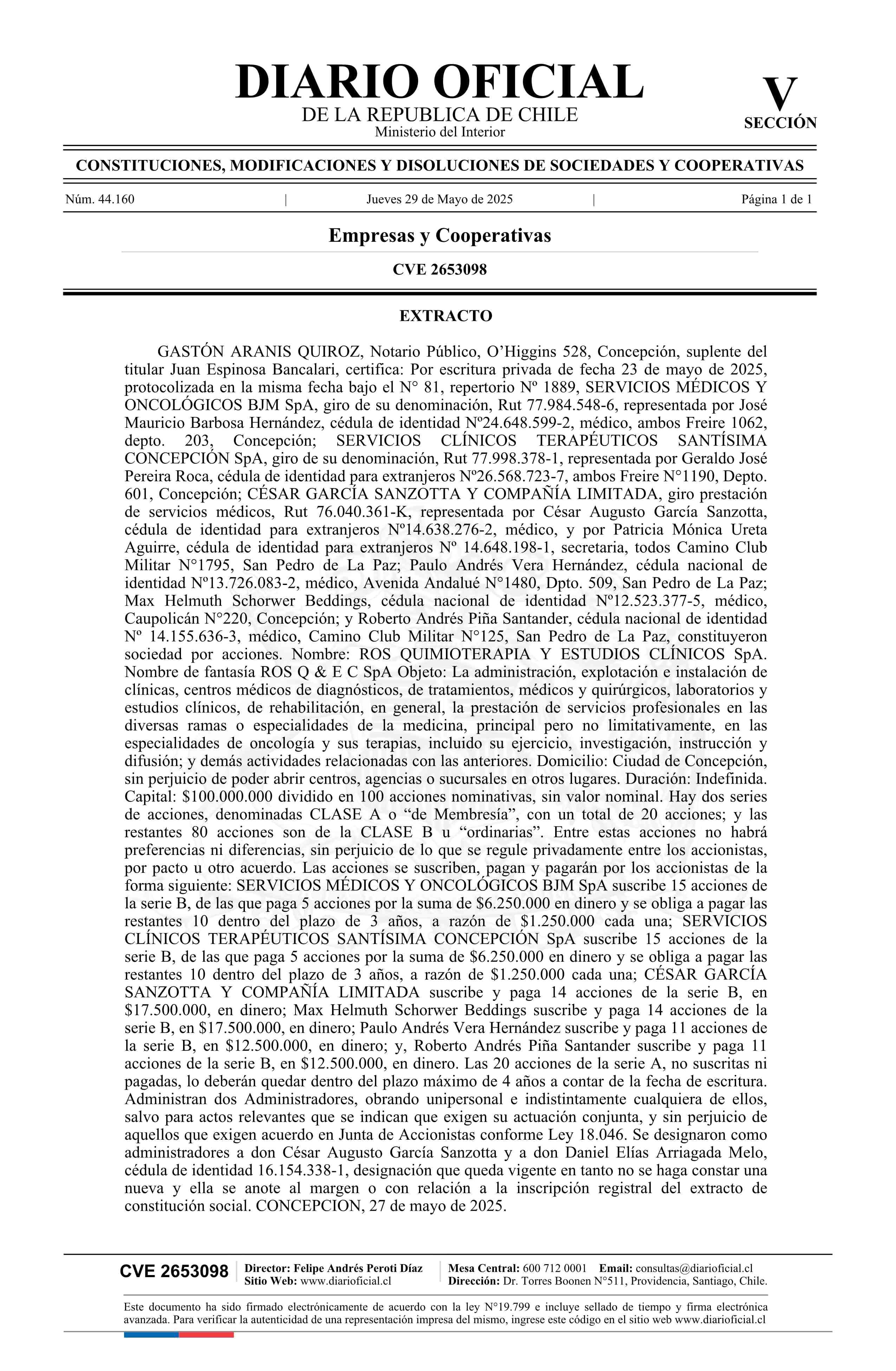 ROS QUIMIOTERAPIA Y ESTUDIOS CLÍNICOS SpA 29-05-2025 Diario Oficial Edición Electrónica |