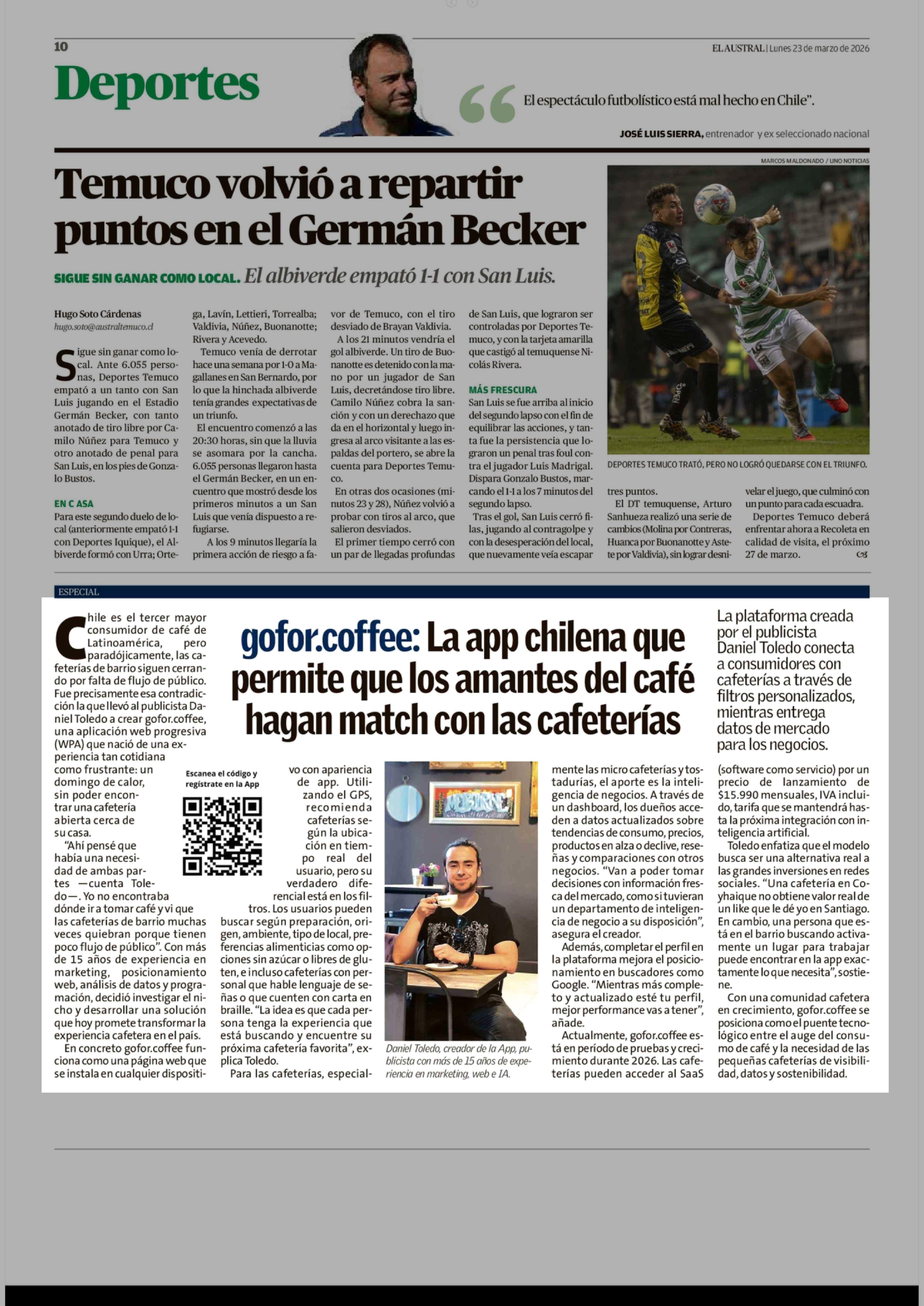 Gofor.coffee: La app chilena que permite que los amantes del café hagan match con las cafeterías 23-03-2026 El Austral de la Araucanía |