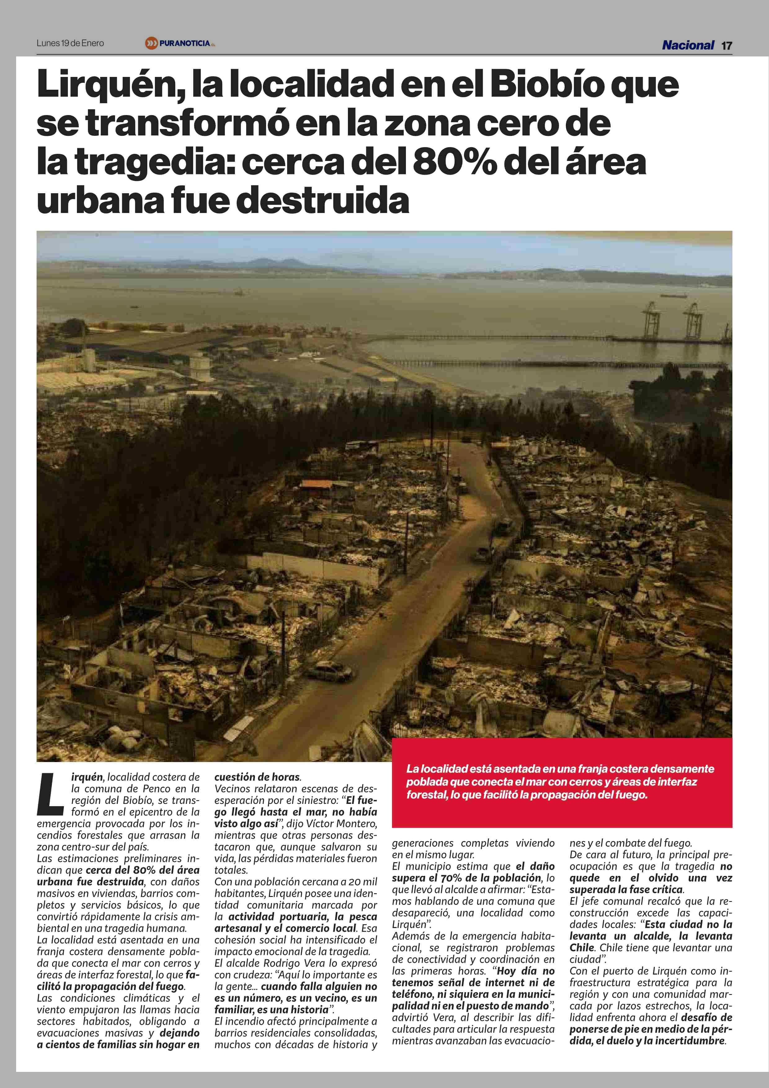 Lirquén, la localidad en el Biobío que se transformó en la zona cero de la tragedia: cerca del 80% del área urbana fue destruida 19-01-2026 Puranoticia.cl |