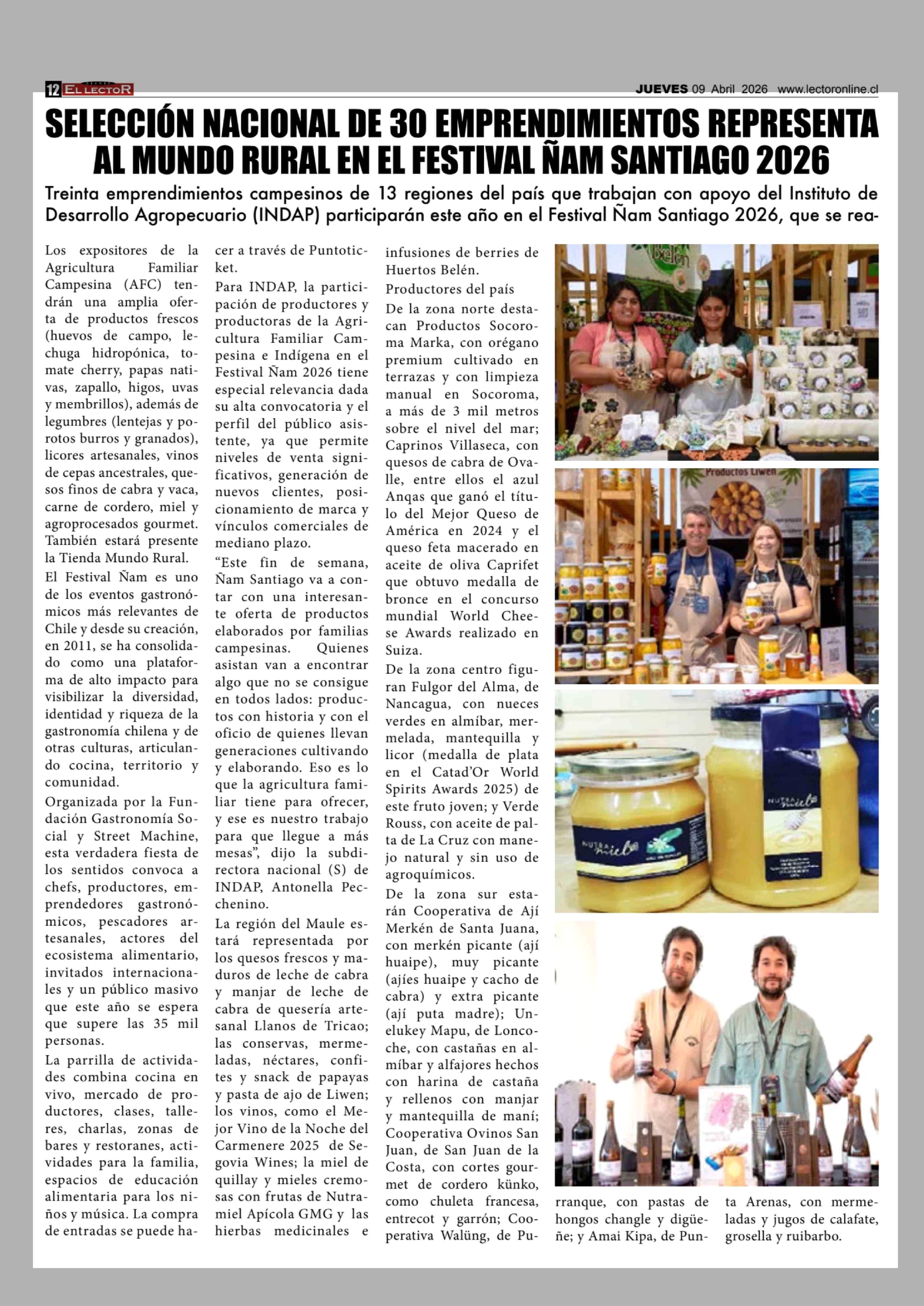 SELECCIÓN NACIONAL DE 30 EMPRENDIMIENTOS REPRESENTA AL MUNDO RURAL EN EL FESTIVAL NAM SANTIAGO 2026 09-04-2026 El Lector |