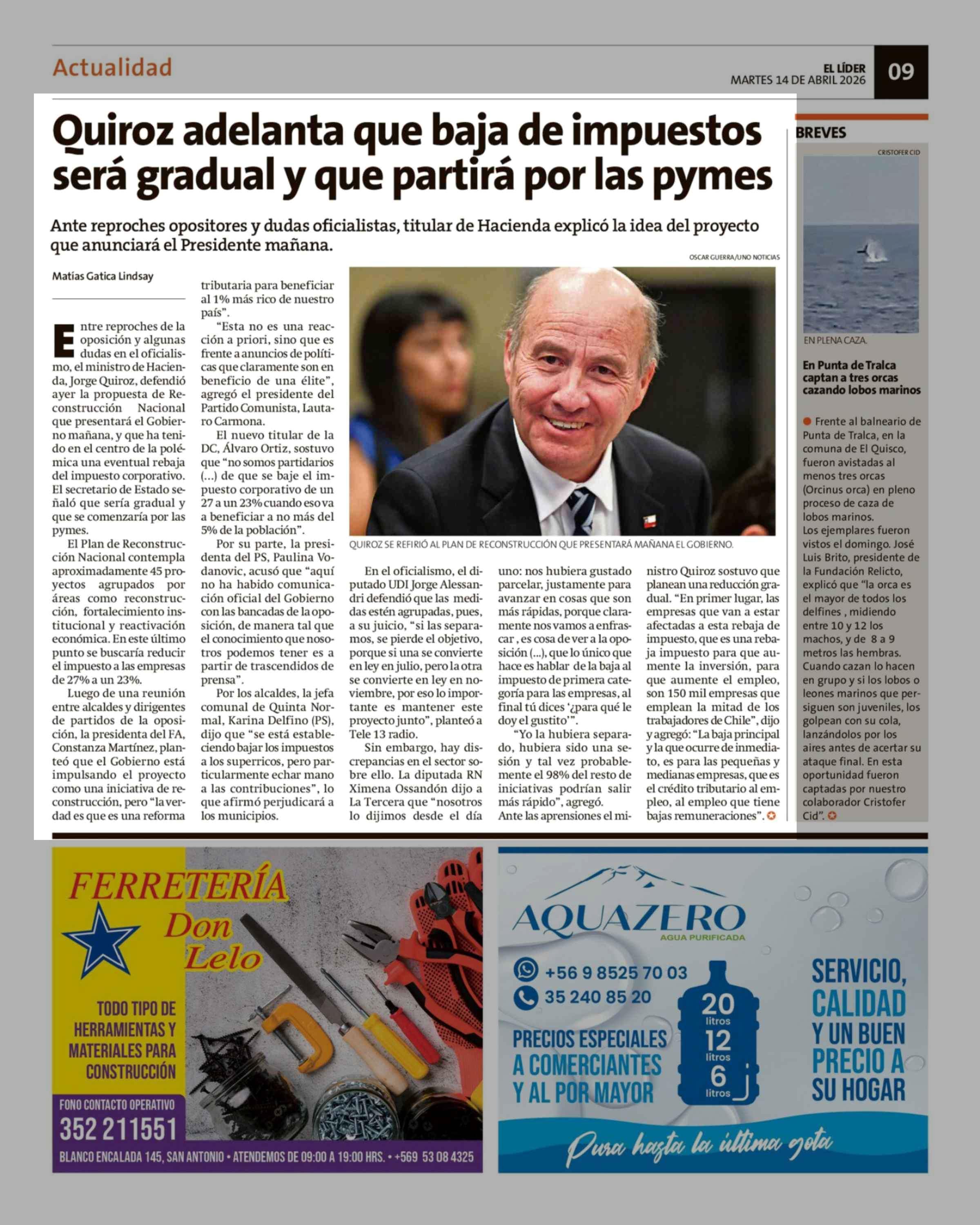 Quiroz adelanta que baja de impuestos será gradual y que partirá por las pymes 14-04-2026 El Líder |