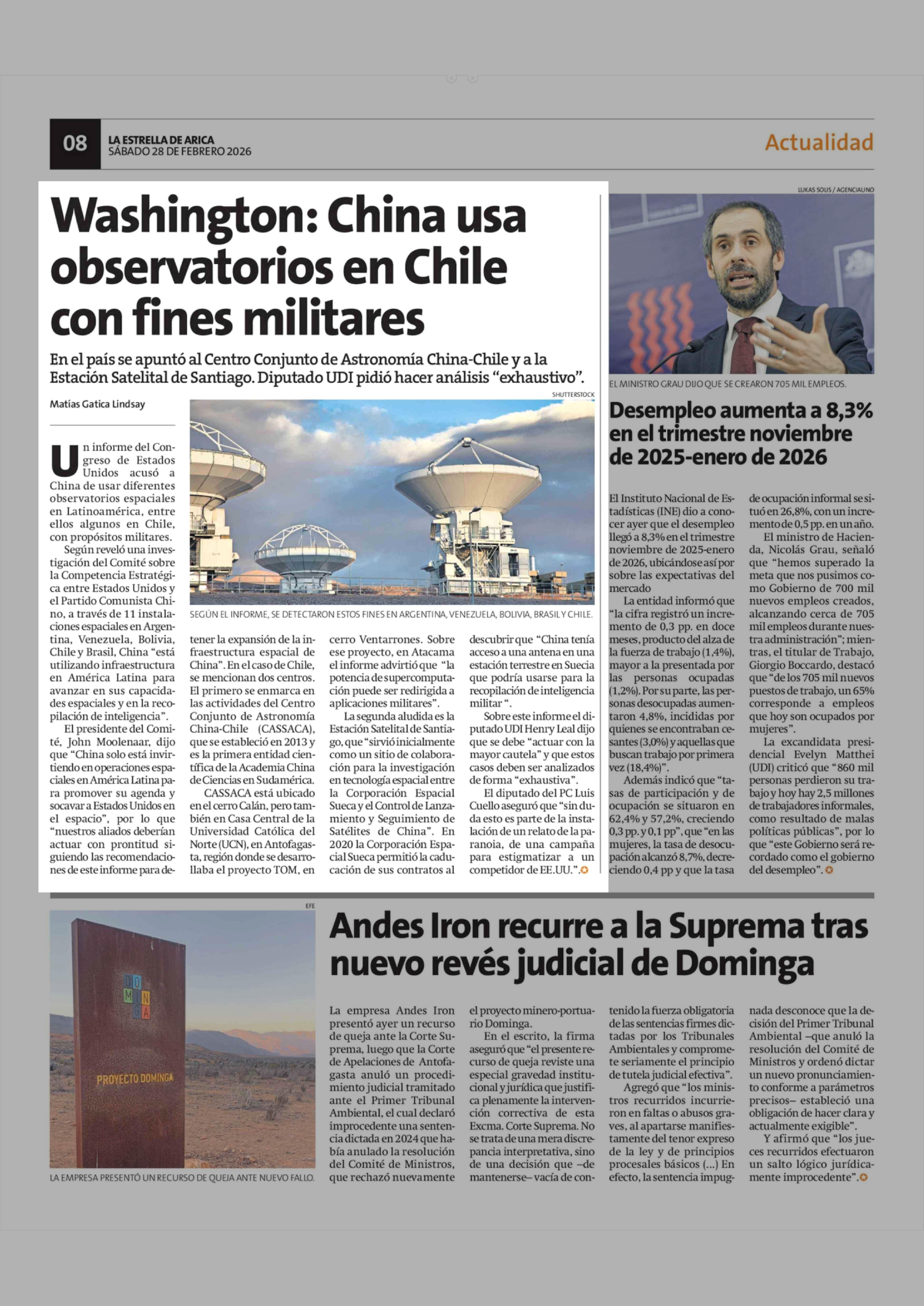 Washington: China usa observatorios en Chile con fines militares 28-02-2026 La Estrella de Arica |