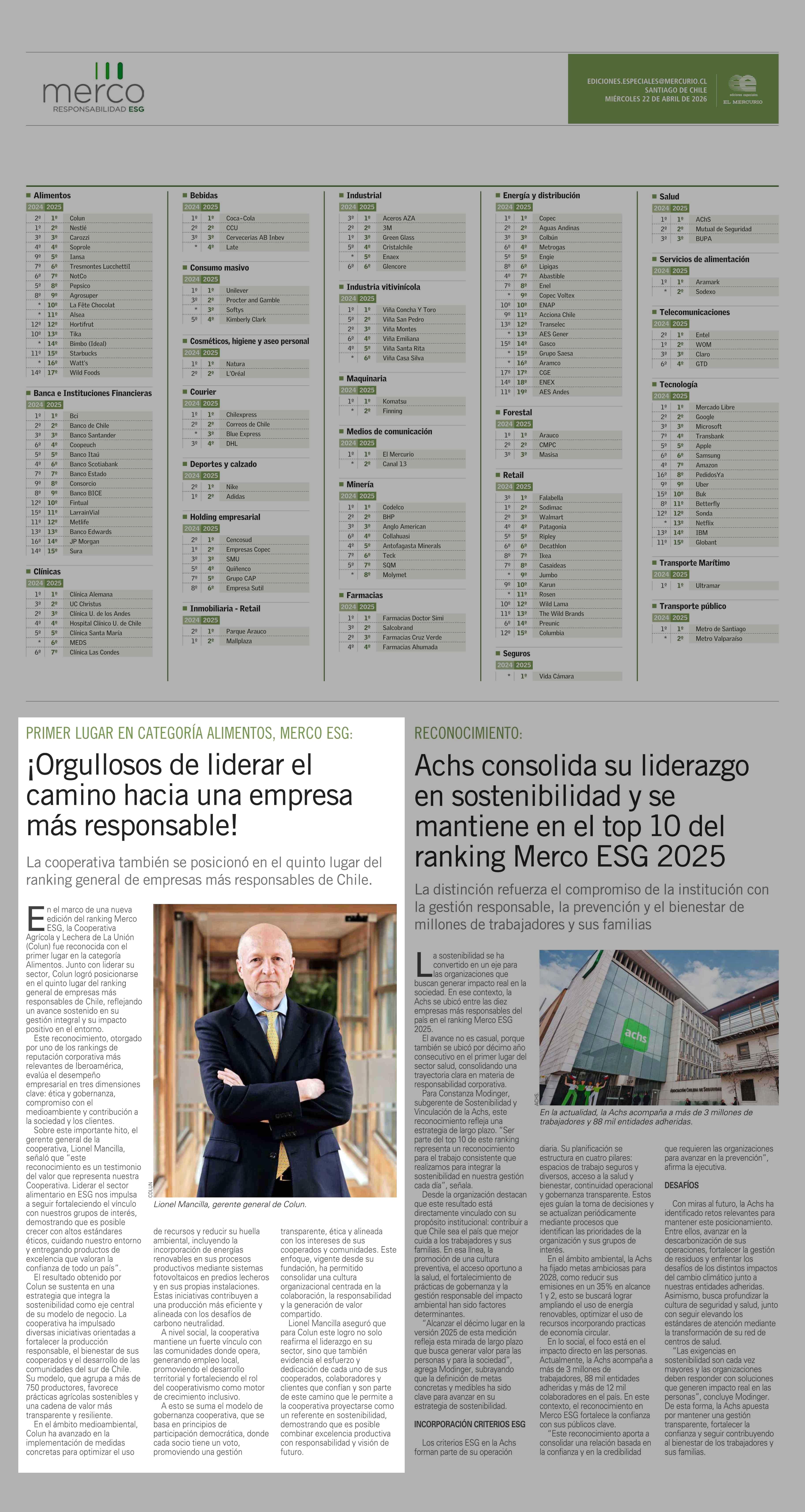 ¡Orgullosos de liderar el camino hacia una empresa más responsable! 22-04-2026 El Mercurio |