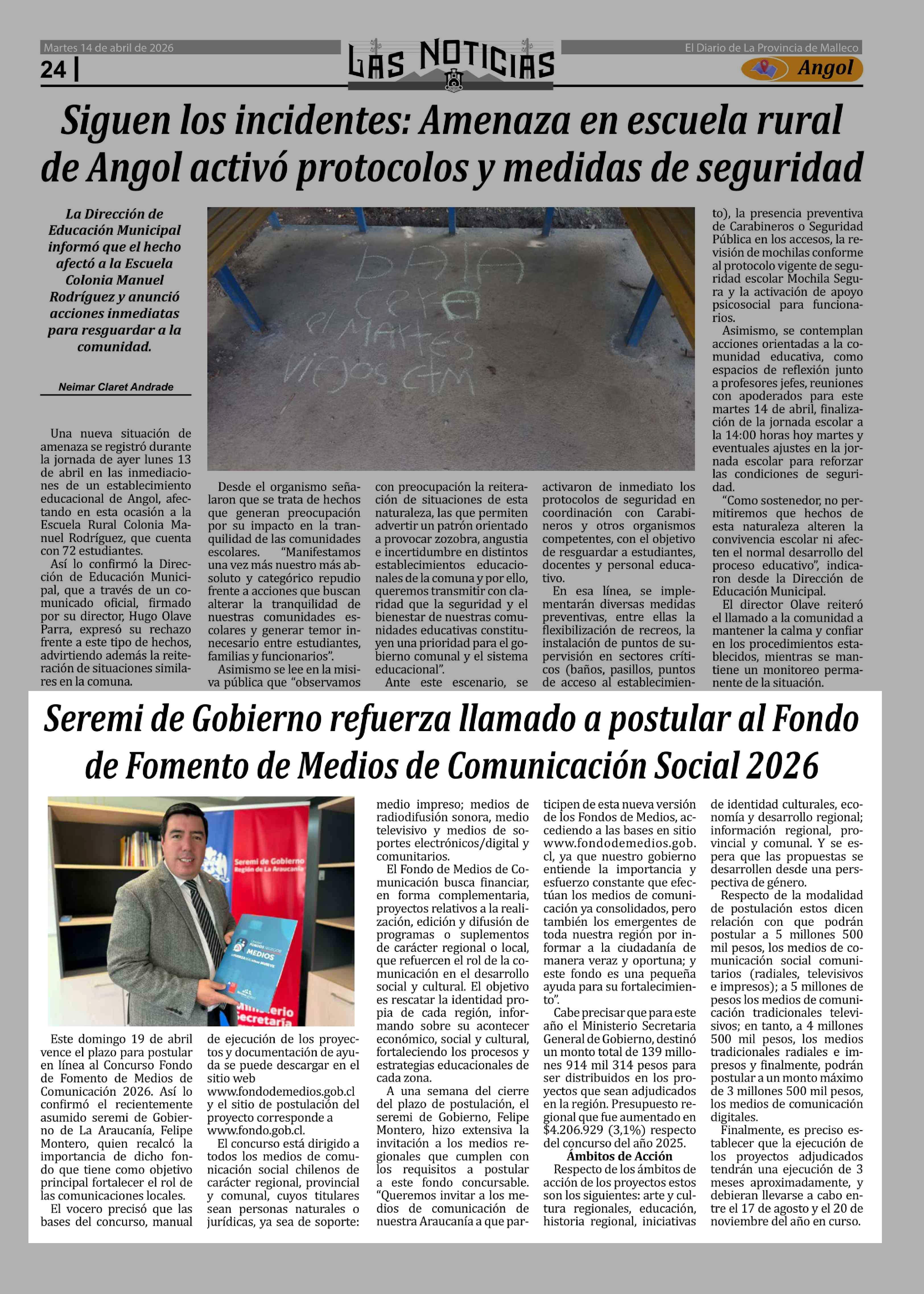 | Fecha: | 14-04-2026 | Sector: | Noticia general | Región: | Región de la Araucanía |