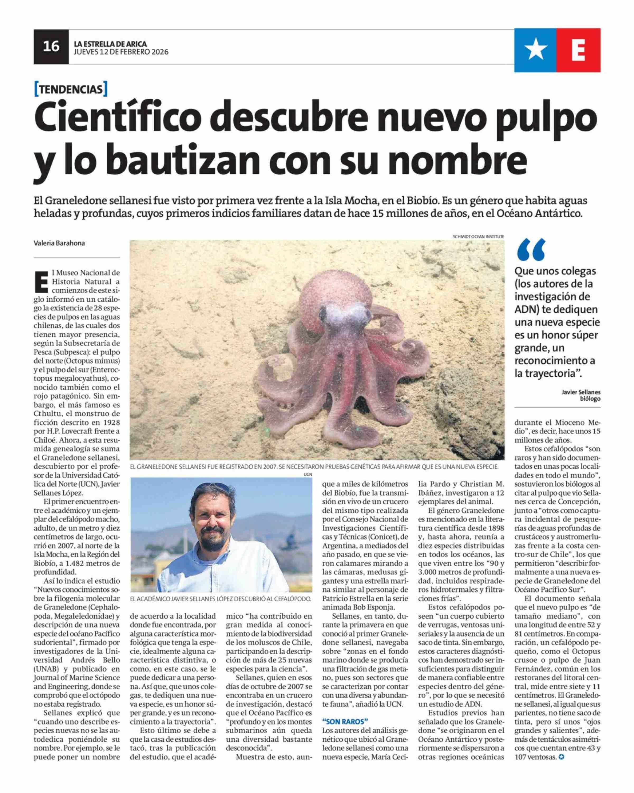 Científico descubre nuevo pulpo y lo bautizan con su nombre 12-02-2026 La Estrella de Arica |