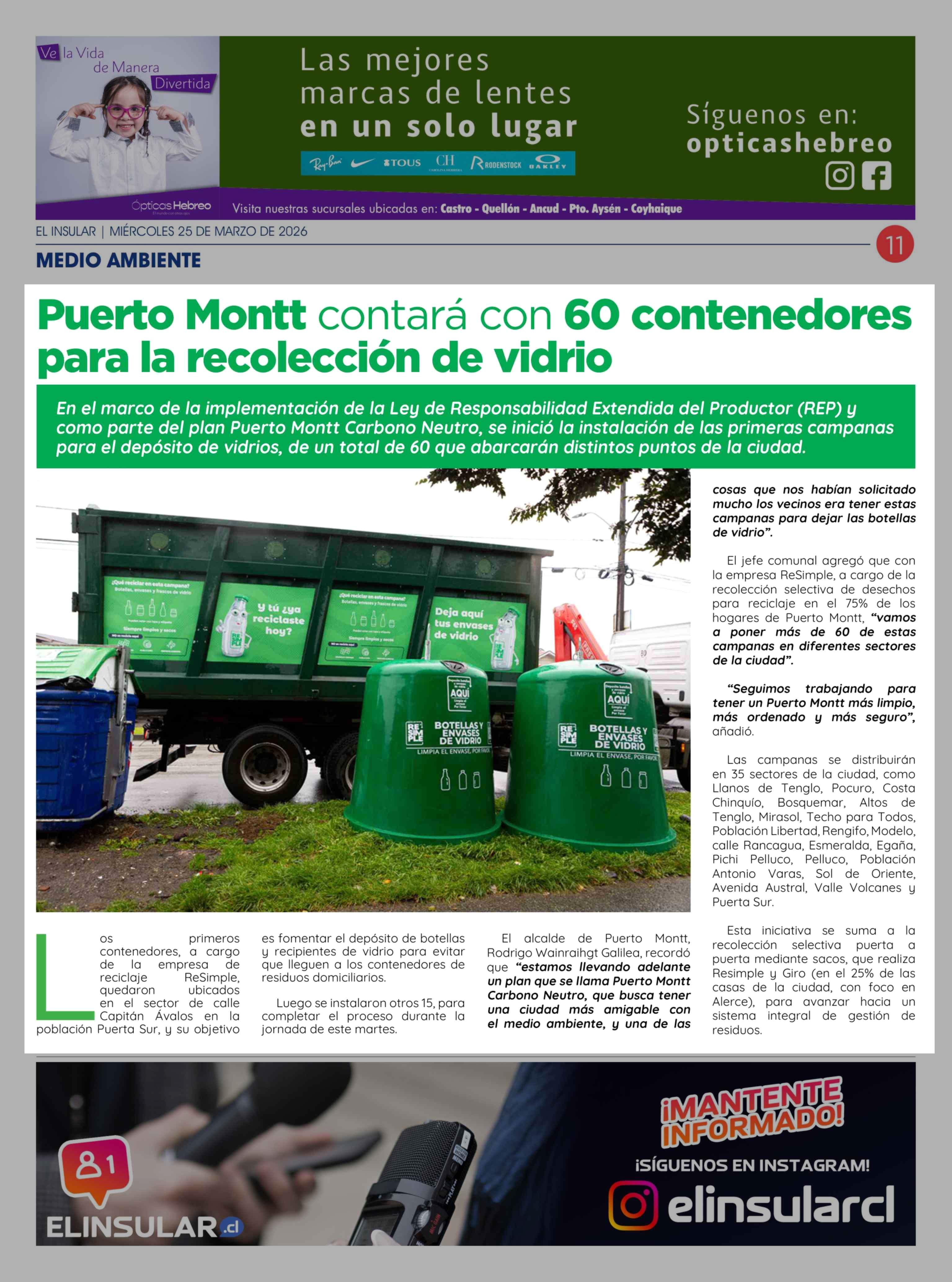 Puerto Montt contará con 60 contenedores para la recolección de vidrio 25-03-2026 El Insular |