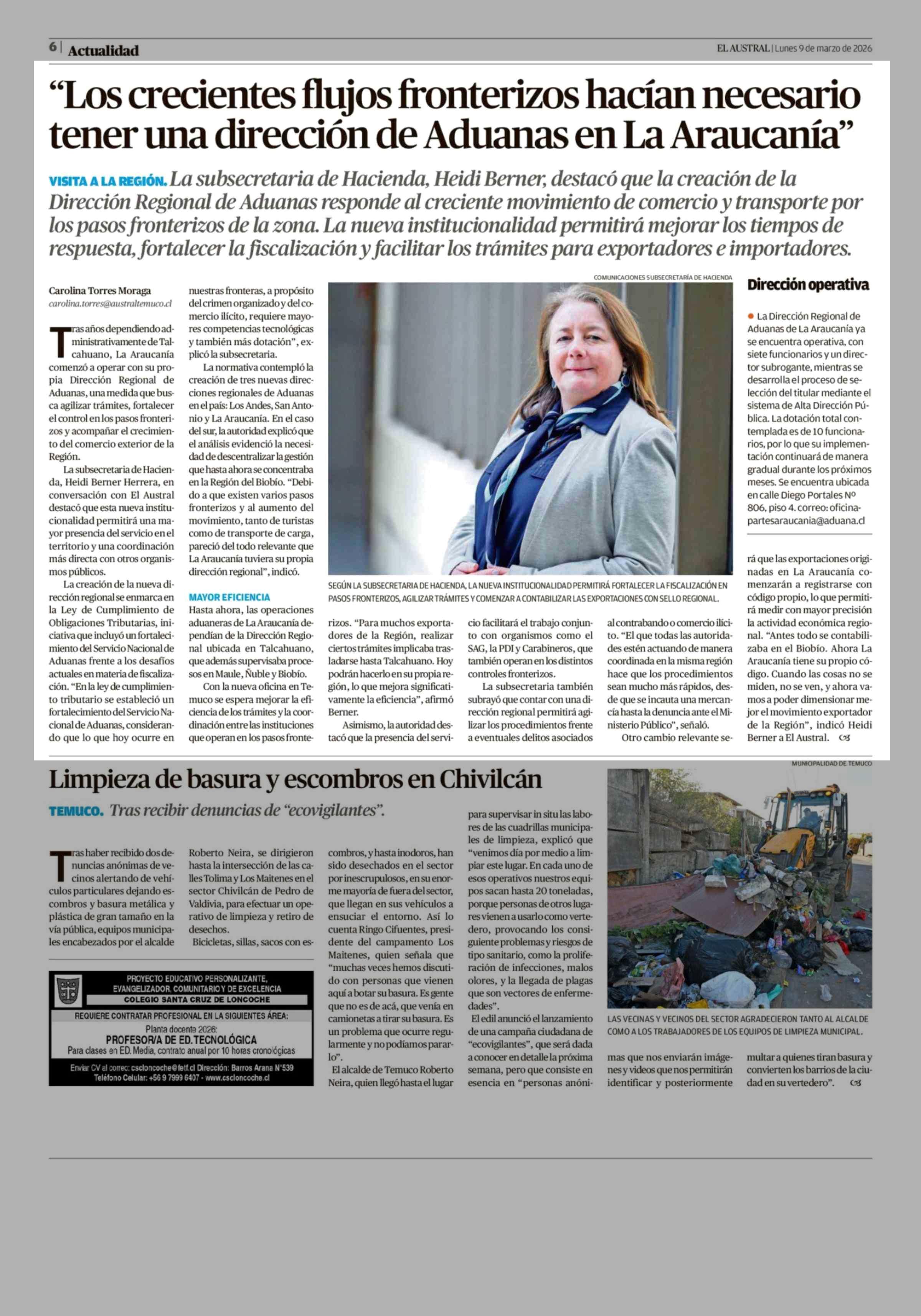 "Los crecientes flujos fronterizos hacían necesario tener una dirección de Aduanas en La Araucanía" 09-03-2026 El Austral de la Araucanía |