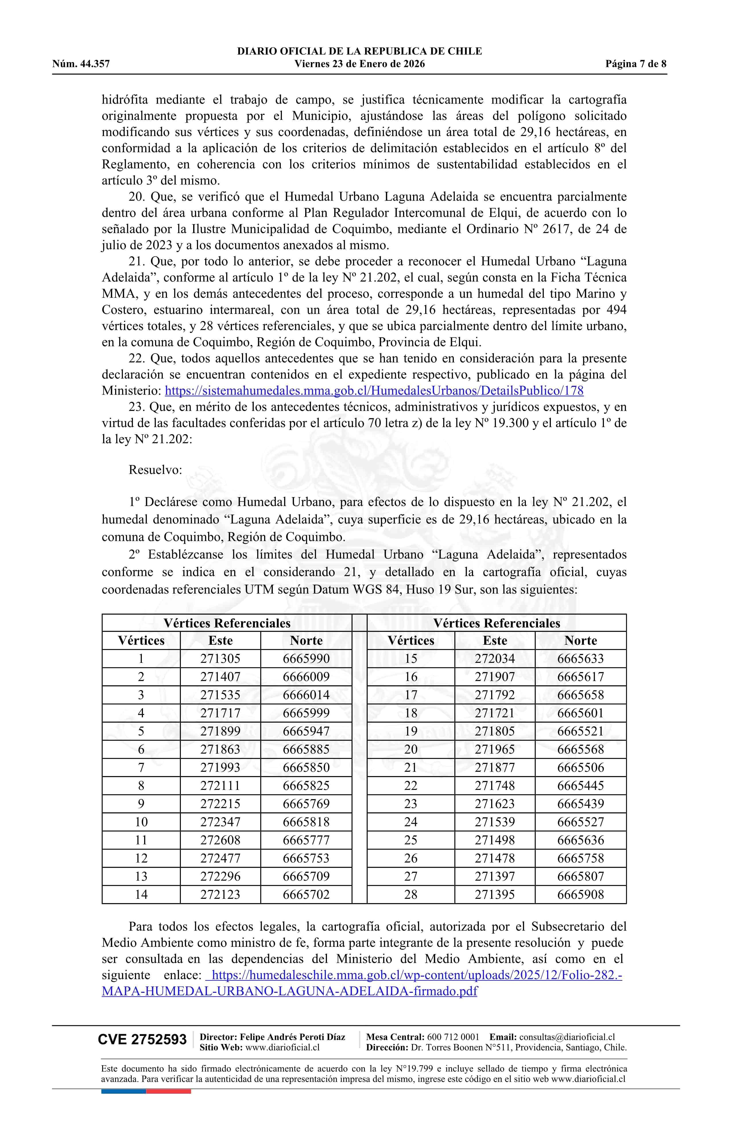Resolución exenta número 9.516, de 2025.- Reconoce, por solicitud municipal, humedal urbano Laguna Adelaida 23-01-2026 Diario Oficial Edición Electrónica |