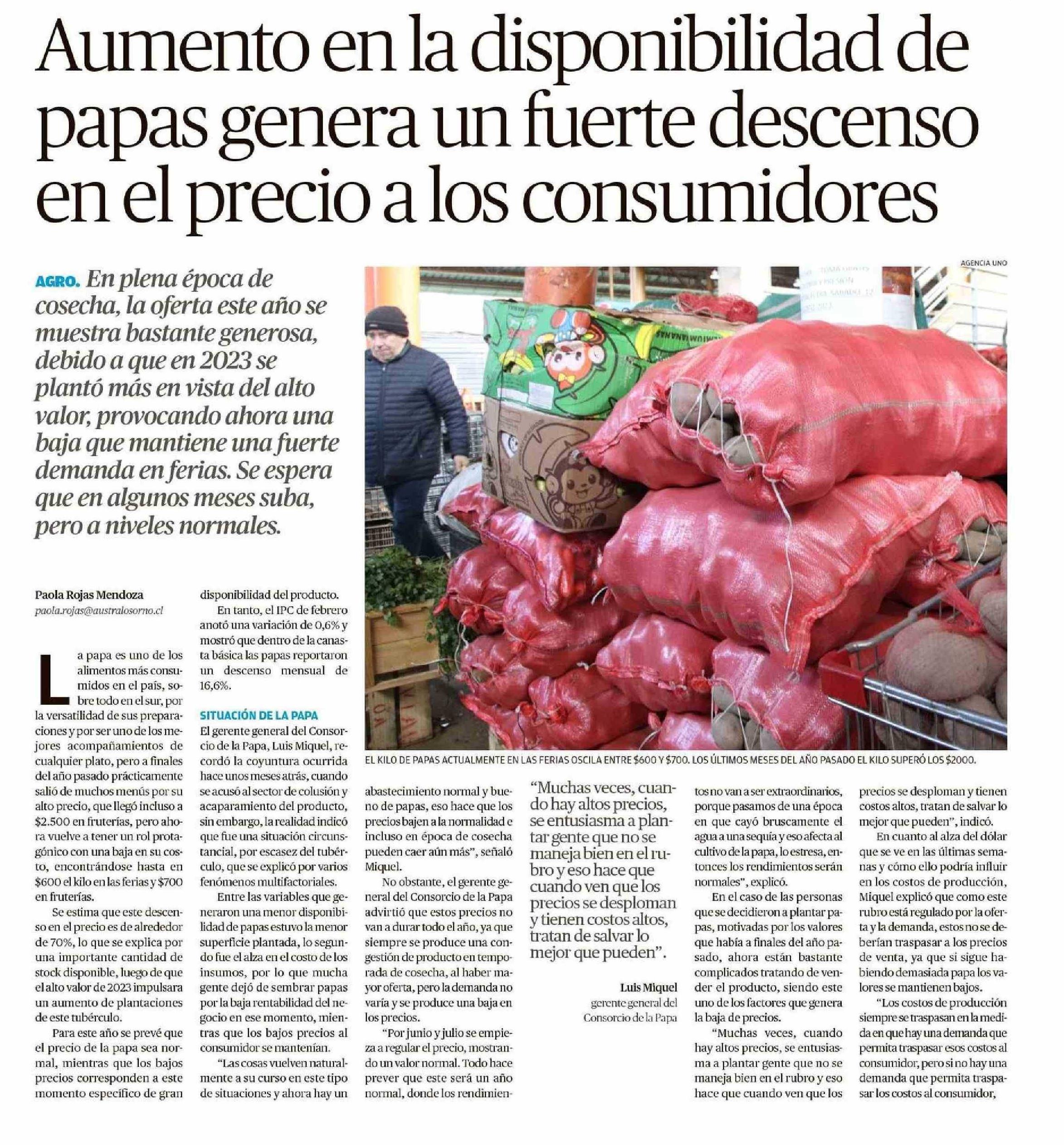 Aumento en la disponibilidad de papas genera un fuerte descenso en el precio a los consumidores 11-03-2024 El Austral de Osorno |