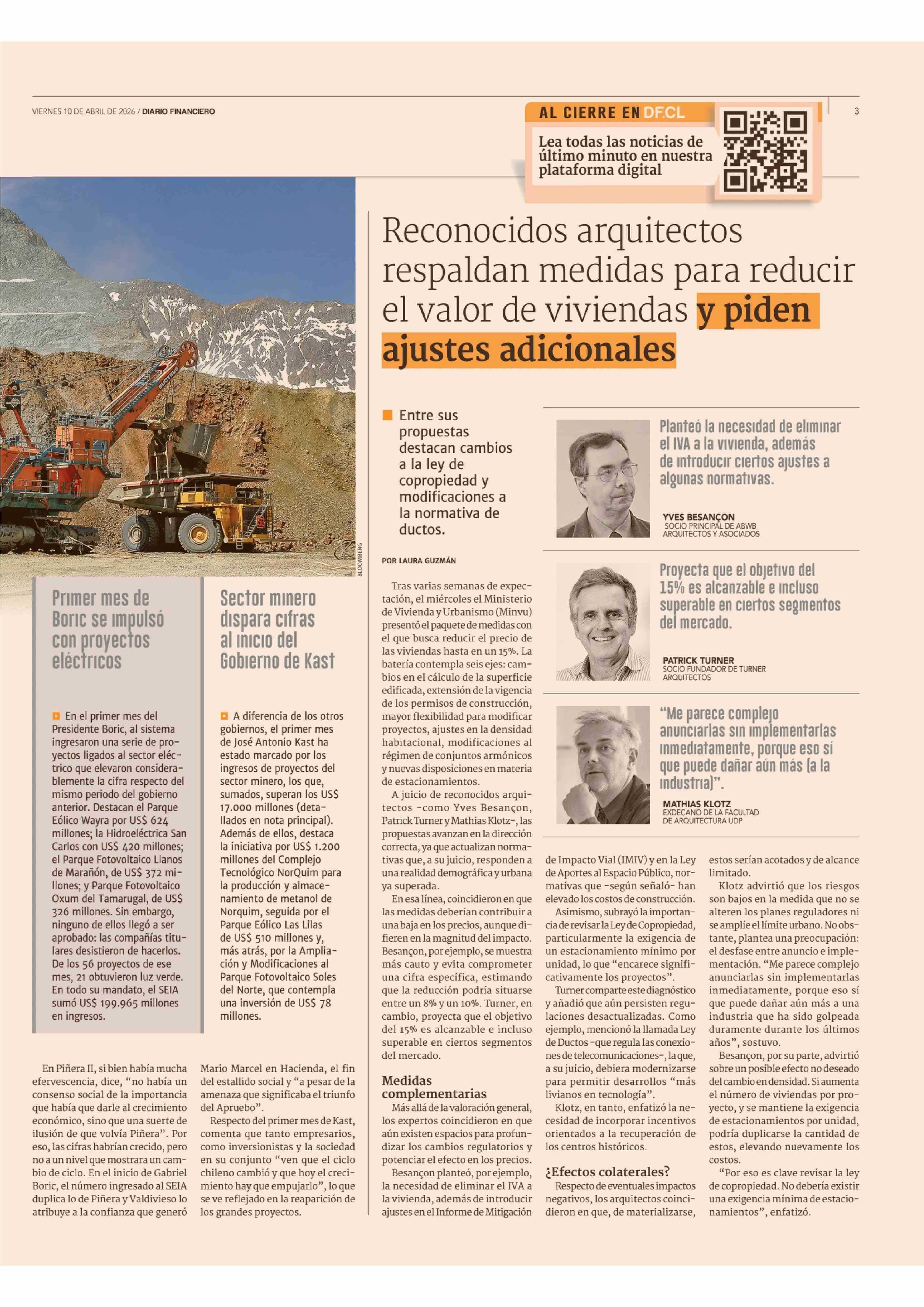 Reconocidos arquitectos respaldan medidas para reducir el valor de viviendas y piden ajustes adicionales 10-04-2026 Diario Financiero |
