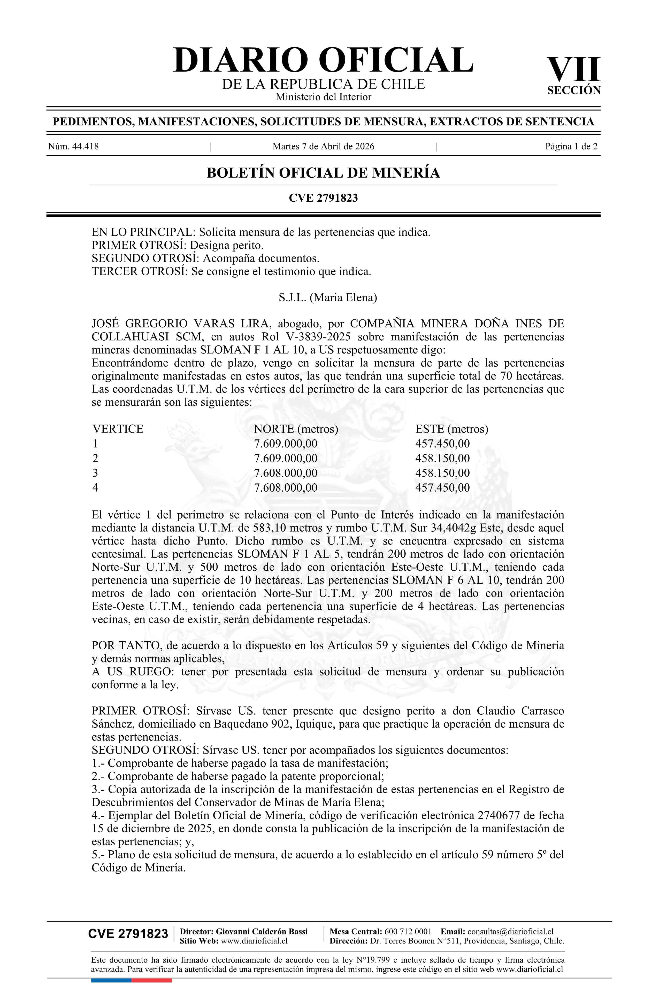 SLOMAN F 1 AL 10 / Compañía Minera Doña Inés de Collahuasi SCM 07-04-2026 DIARIO OFICIAL CHILE - BOLETÍN OFICIAL DE MINERÍA |
