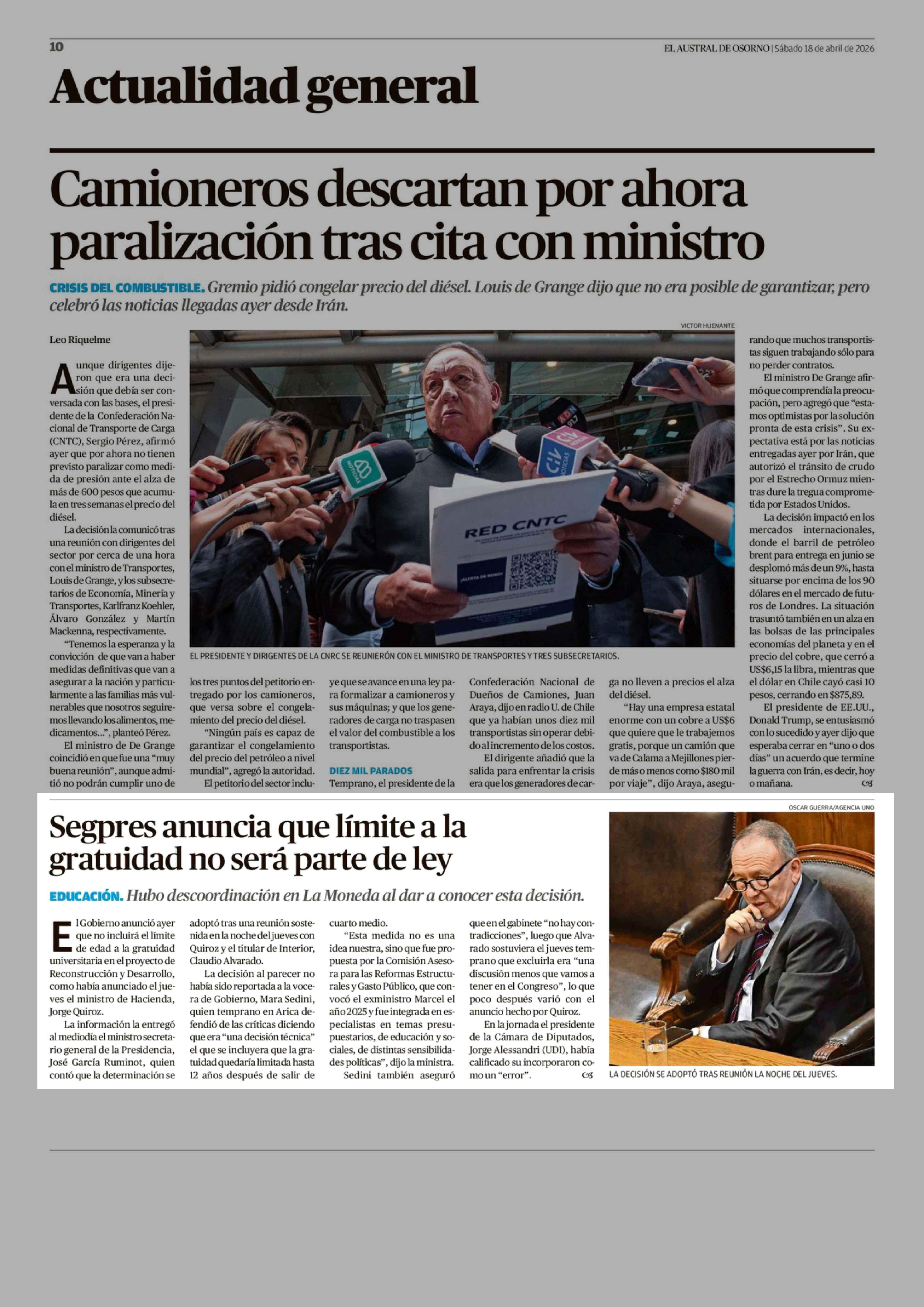 Segpres anuncia que límite a la gratuidad no será parte de ley 18-04-2026 El Austral de Osorno |
