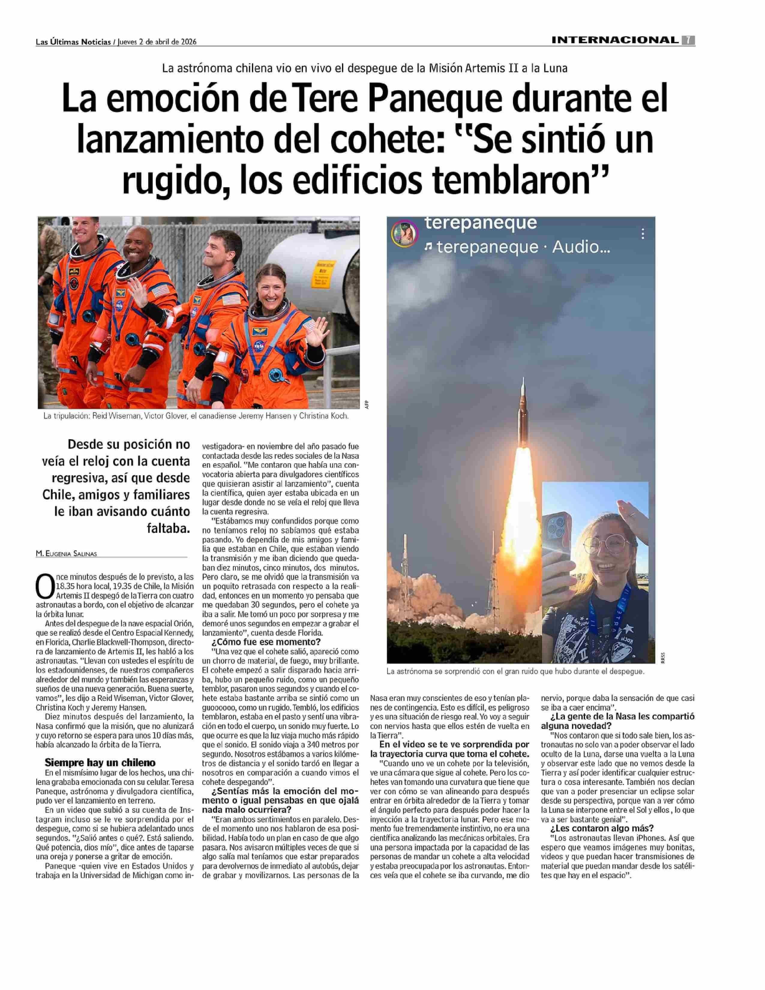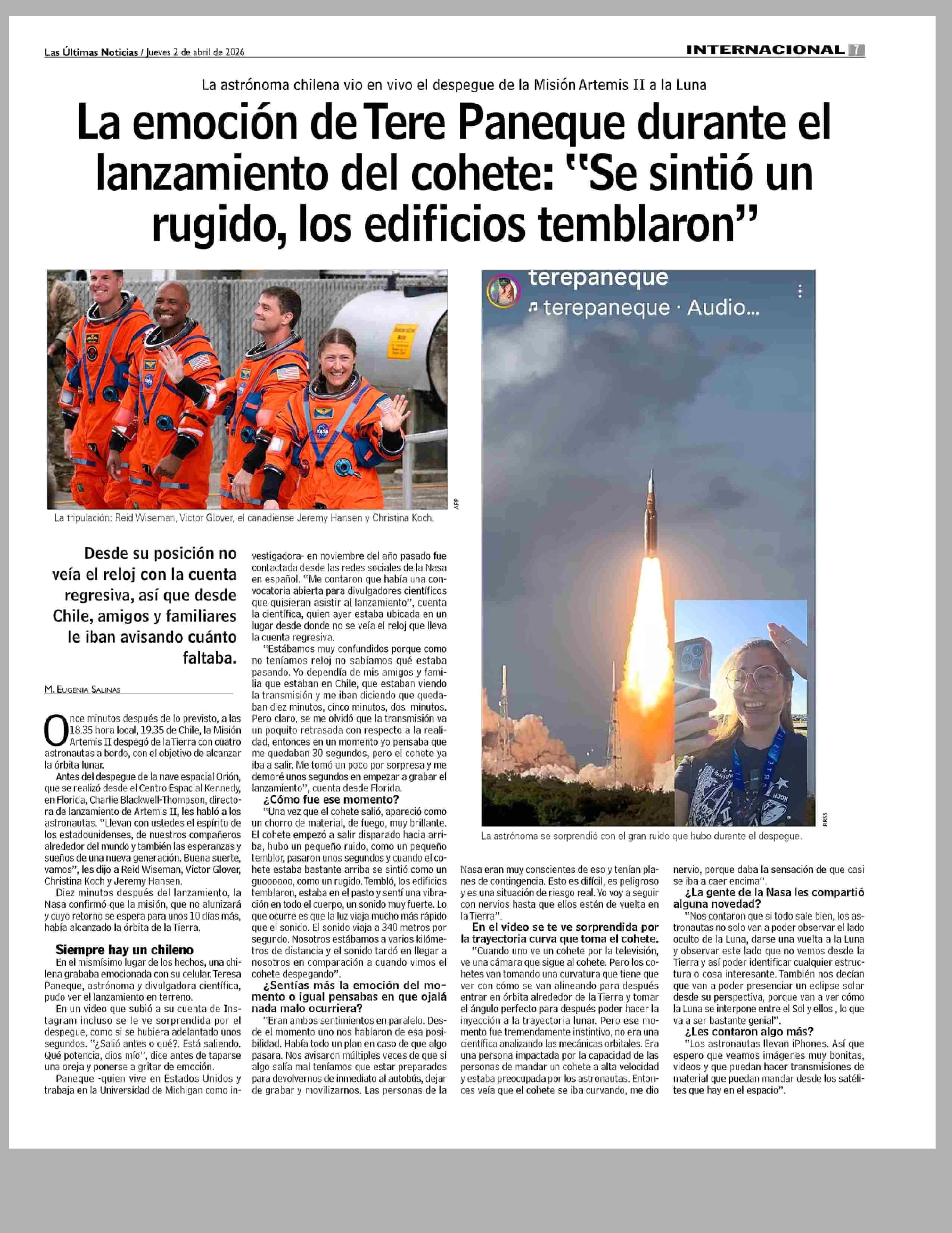 La emoción deTere Paneque durante el lanzamiento del cohete: "Se sintió un rugido, los edificios temblaron” 02-04-2026 Las Últimas Noticias |