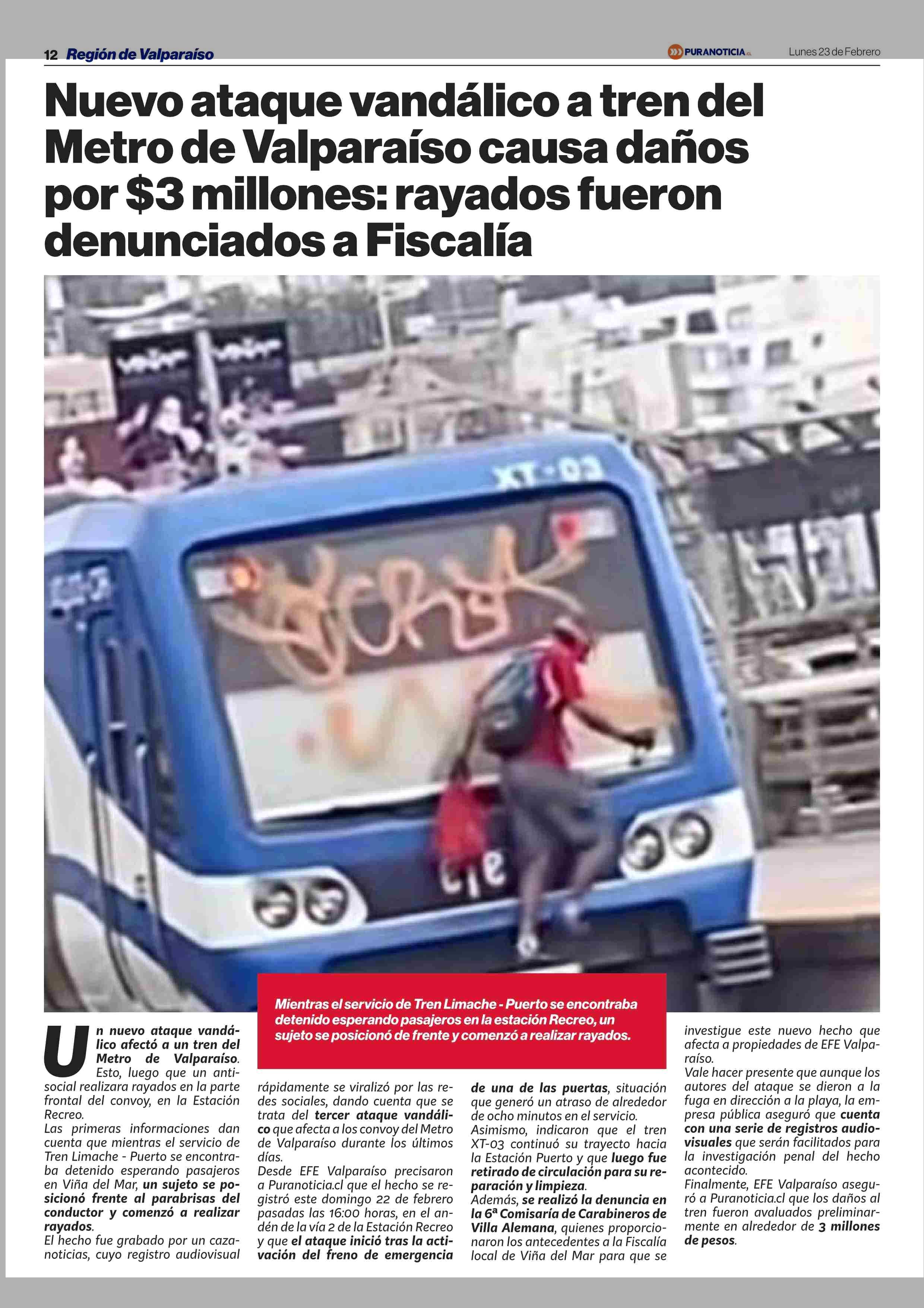 Nuevo ataque vandálico a tren del Metro de Valparaíso causa daños por $3 millones: rayados fueron denunciados a Fiscalía 23-02-2026 Puranoticia.cl |